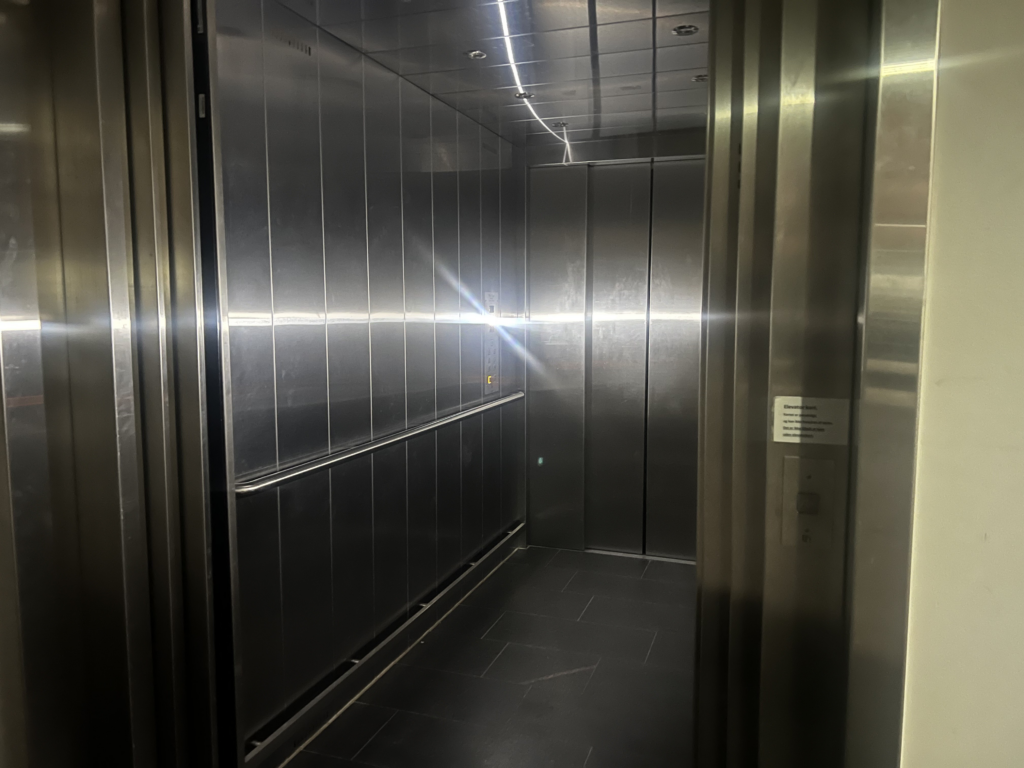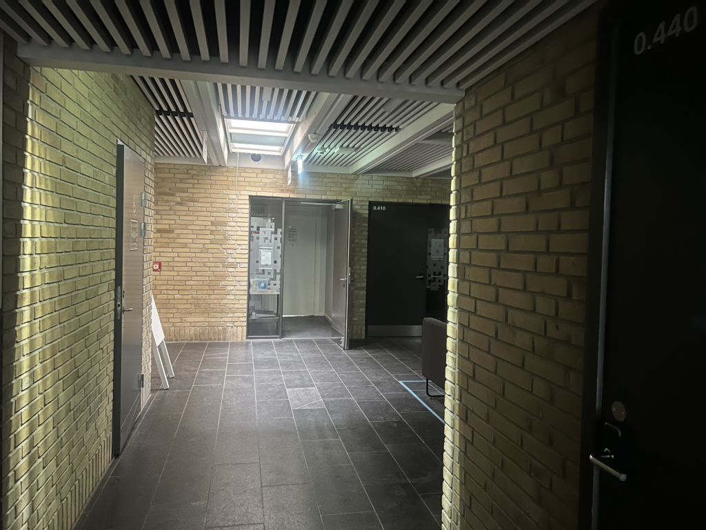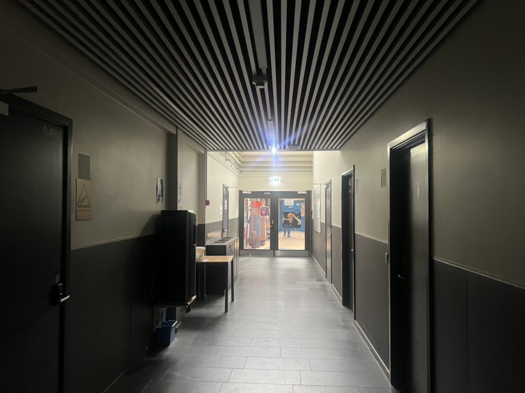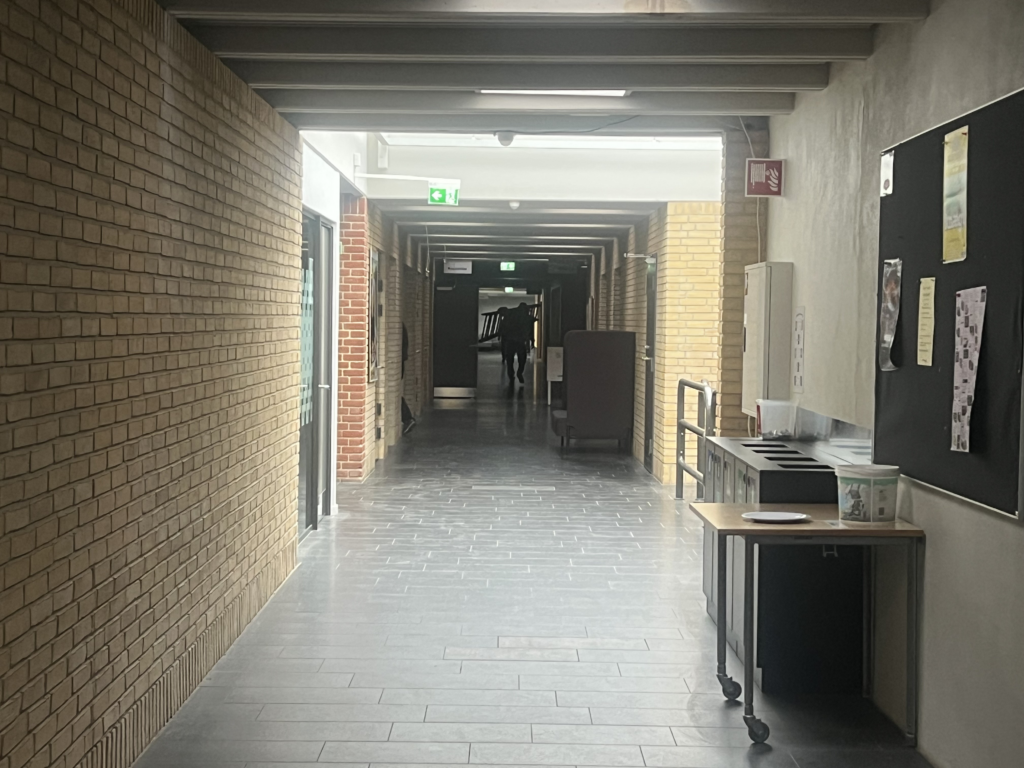 Også Campus Bornholm er ramt af nedbruddet. Her står elevatorer tomme og ude af drift, mens de mørklagte gange kun lyses op af ovenlysvinduer.