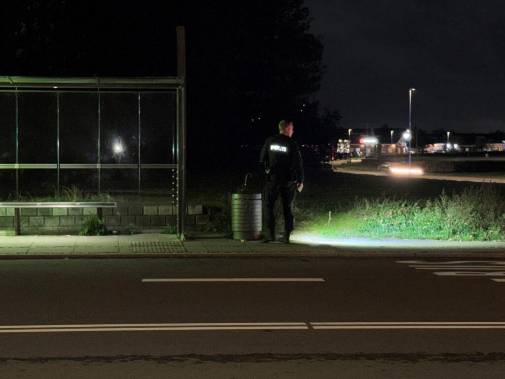 Sådan så gerningsstedet ud omkring overfaldet, der fandt sted ved Honningvænget i Tilst, hvor patruljer og ambulanceberedskabet fortsat var til stede sent lørdag aften.