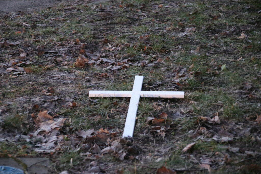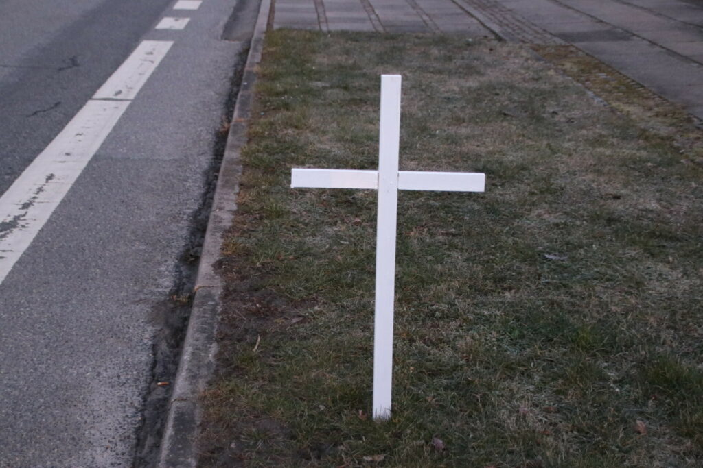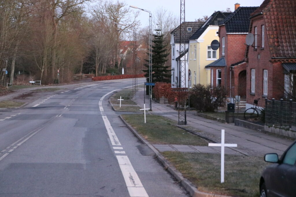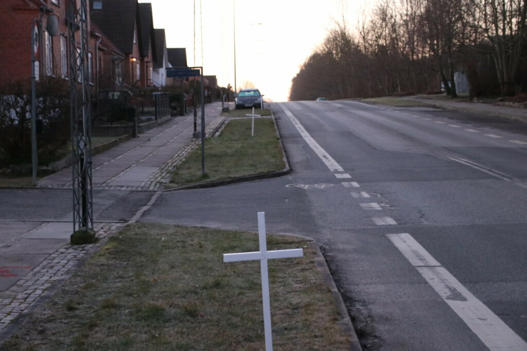 5 hvide kors står lørdag langs Faaborgvej i Assens. Lokale har i protest sat 5 kors op for de trafikdræbte som har mistet livet på strækningen ”dødsvejen”.
