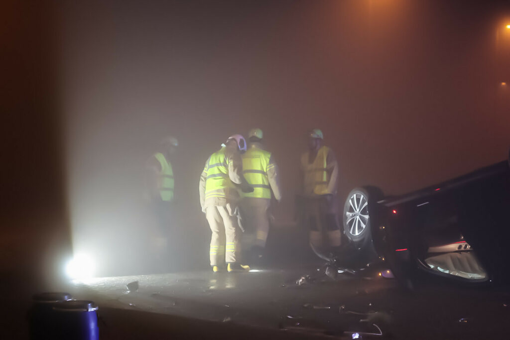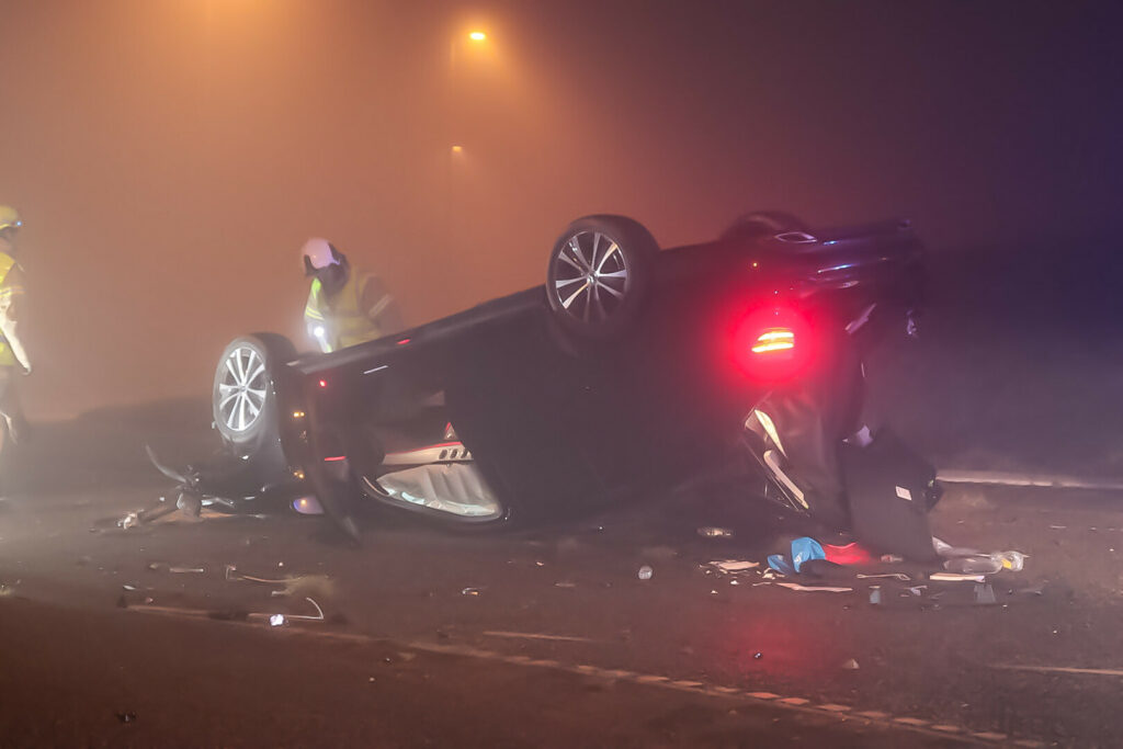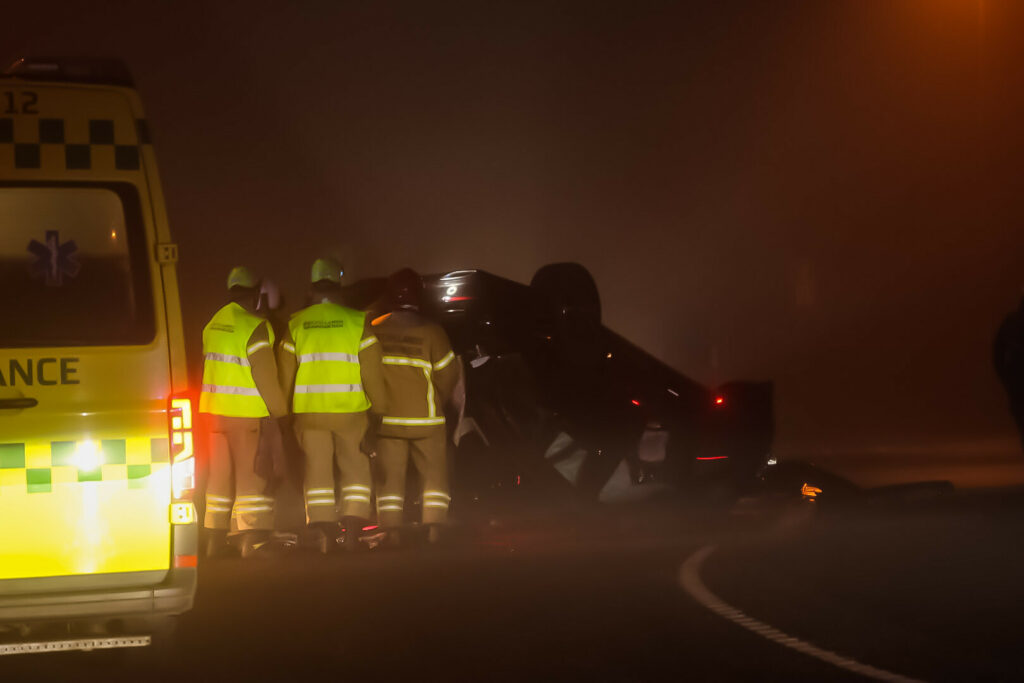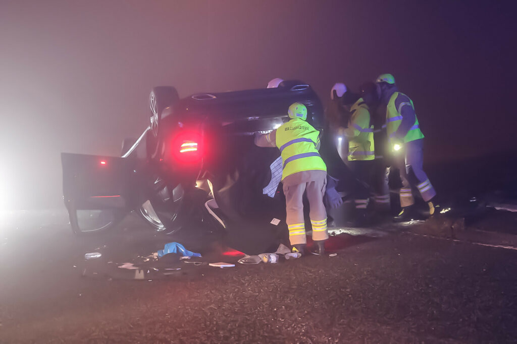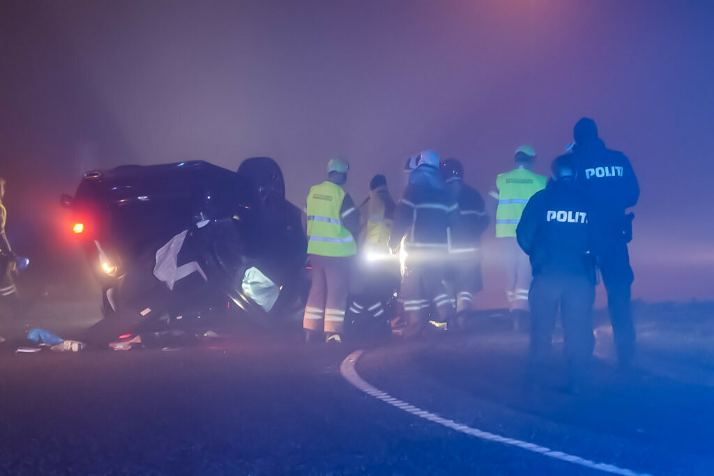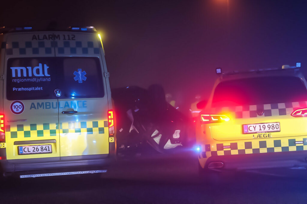 En bil er natten til onsdag endt på taget i et alvorligt færdselsuheld i rundkørslen på Stillingvej i Harlev J.