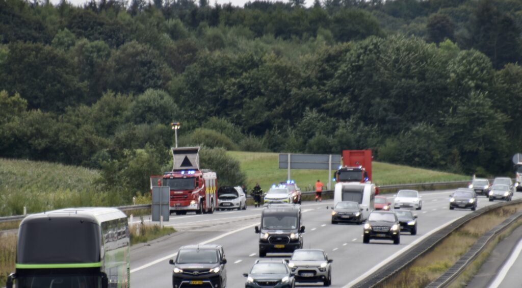 Den brændende bil har ikke givet trafikale problemer, da den holder i nødsporet.