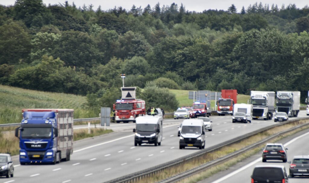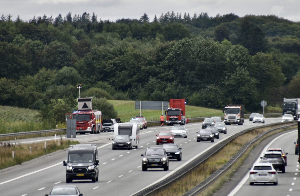 En bil brød i brand på E45 ved Vejle syd fredag formiddag.
