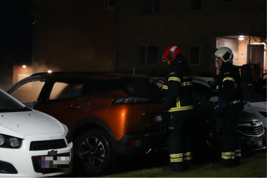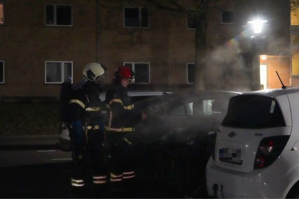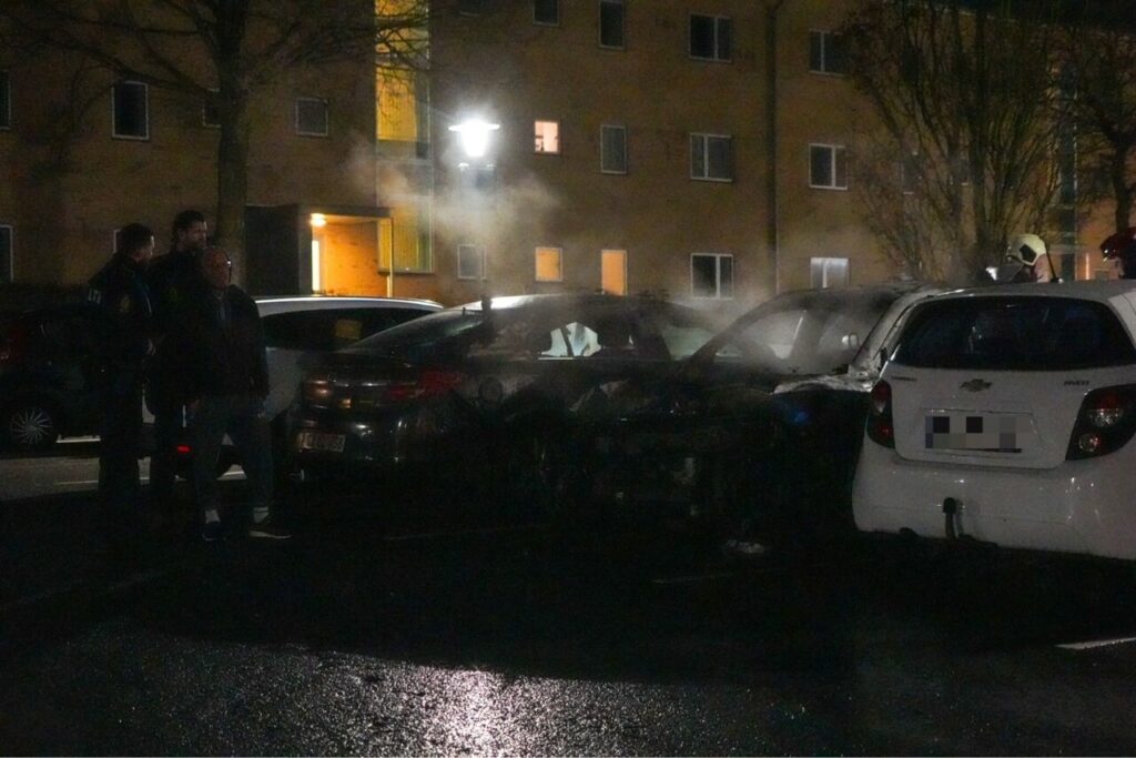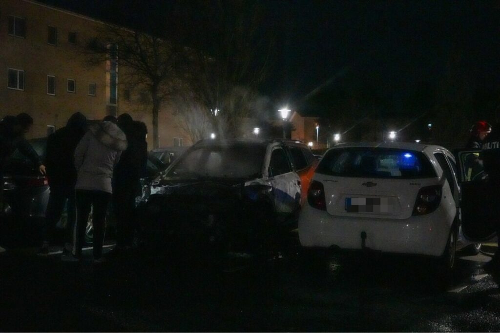 Bilen står i mellem nogle andre biler som har taget kraftig skade og var ved at udvikle sig til en kæde brand, hvor den ville have brændt flere biler af.