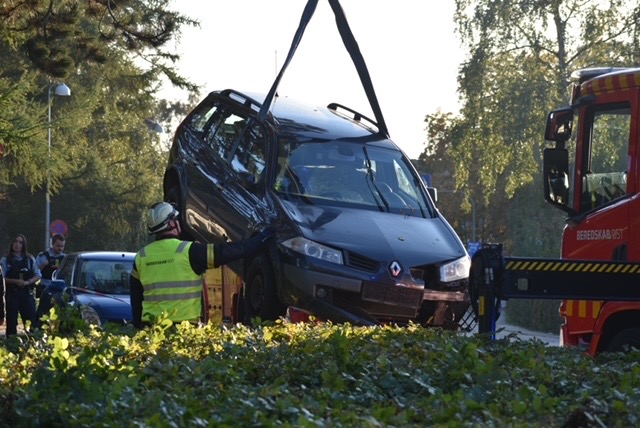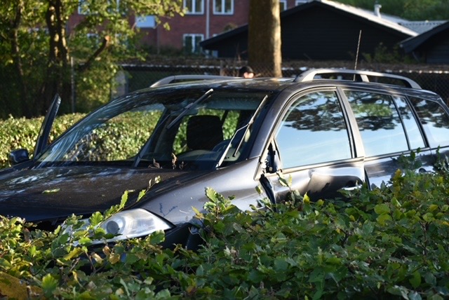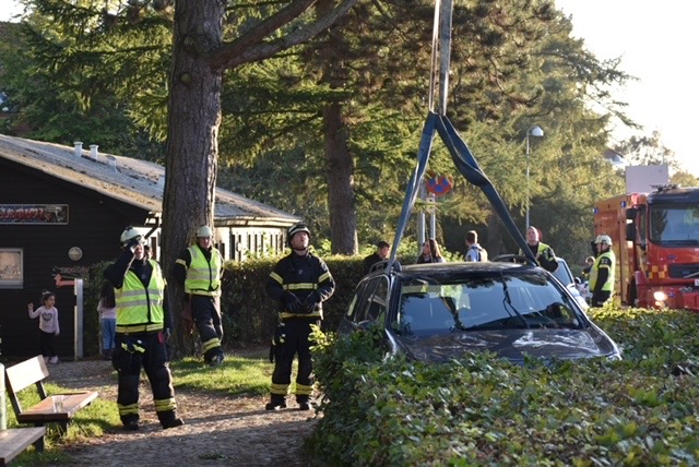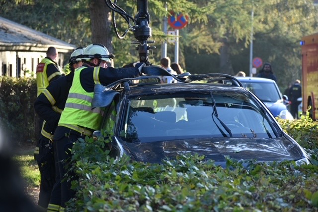 En af de forulykkede biler er ved ulykken landet i en busk og måtte med kran løftes ud af busken.