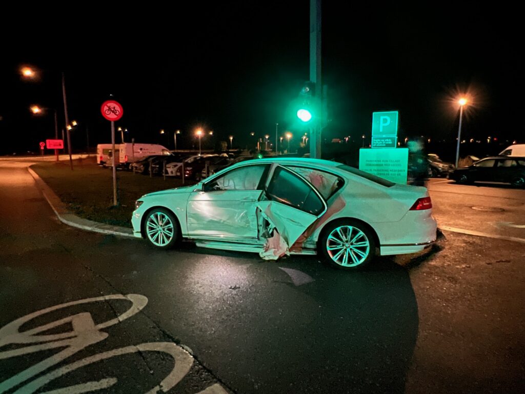 Politiet rykkede ud til uheldet, hvor en hvid Volkswagen stod stille midt i krydset foran Royal Arena. Bilen er blevet ramt på siden, hvor den ene bagdør næstet er blevet revet af.