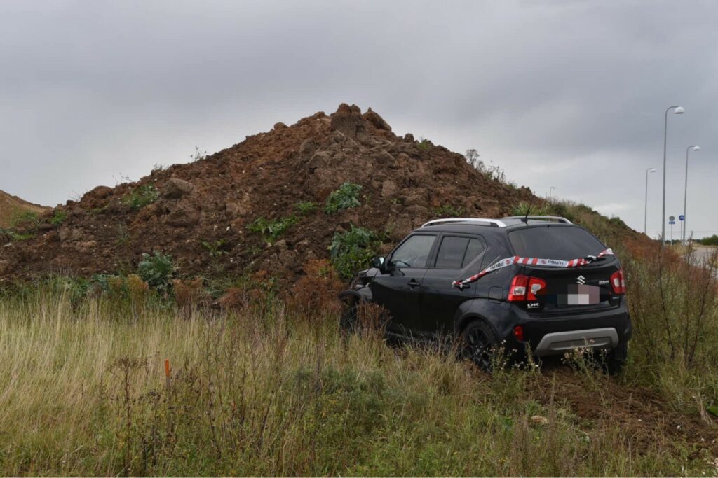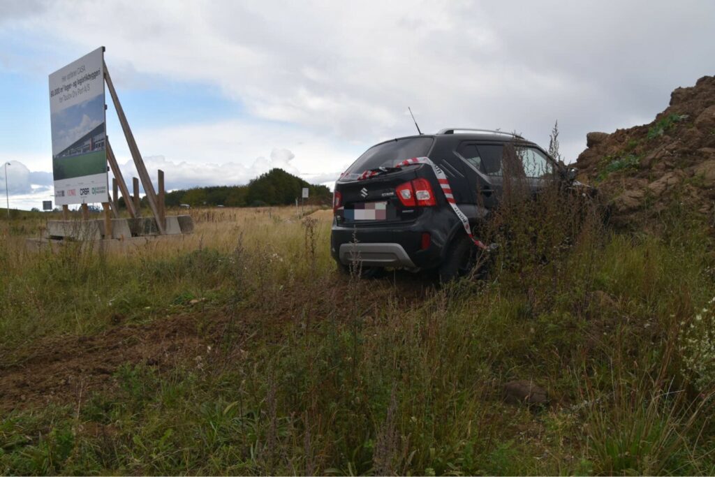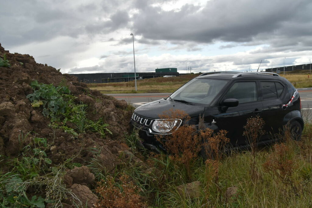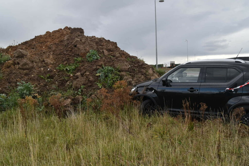 En billist er kommet uheldigt afsted på Skærbækvej i Fredericia, hvor bilen har ramt et skilt, og derefter er endt i en stor bunke jord.
