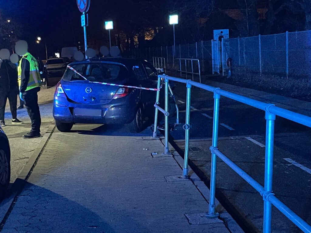 Bilen har påkørt et rækværk/ hegn ved mellem en cykelsti og et fortorv.