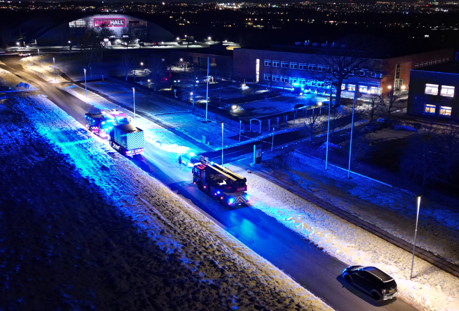 Hasselager Alle i Viby J er også adressen til Aarhus Tech Gymnasium og mandskabet arbejder på at undersøge, om der kan være tale om et gas- eller syreudslip på skolen.