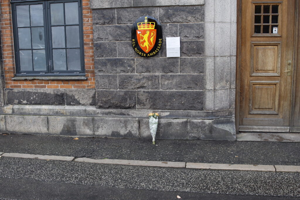 Efter gårsdagens femdobbelte drab i norske Kongsberg, er der torsdag formiddag sat en enkelt buket blomster foran Norges ambassade i København.