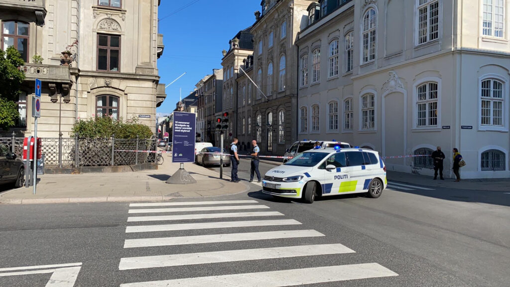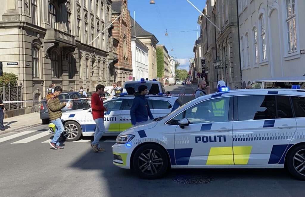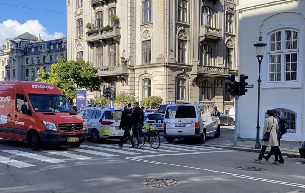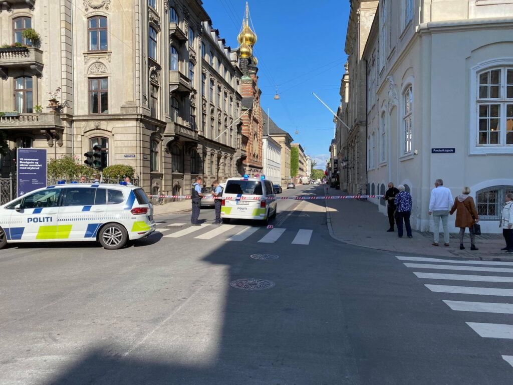Gaden er lukket og bombehunde er rekvireret. Hovedstadens beredskab er kaldt til stand-by med brandslukningskæretøjer og mandskab.