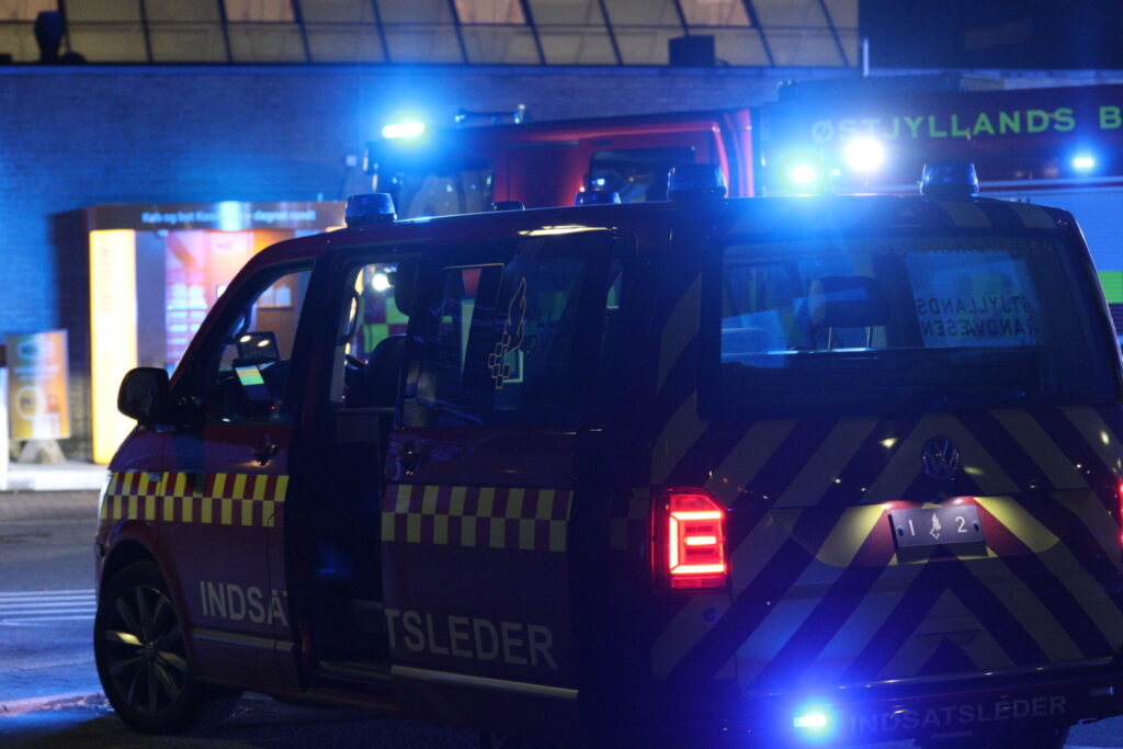Røg stiger op fra indgangspartiet og slukningsarbejdet er i gang.