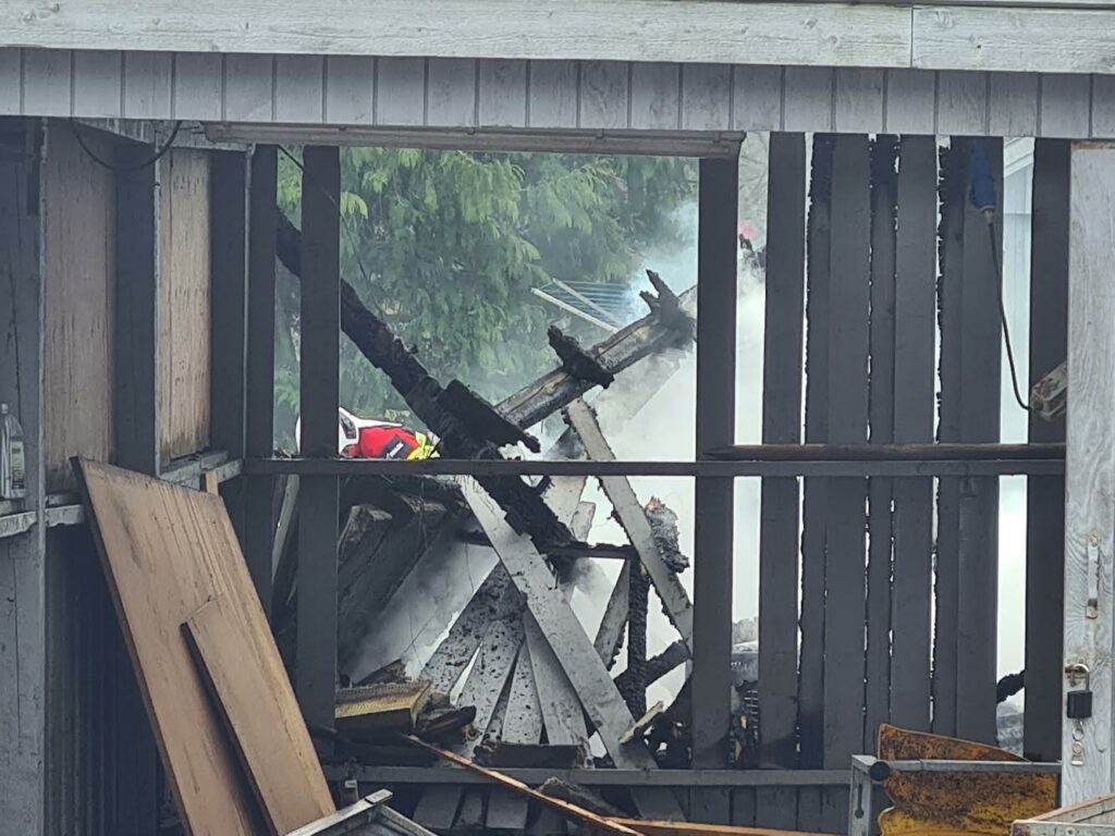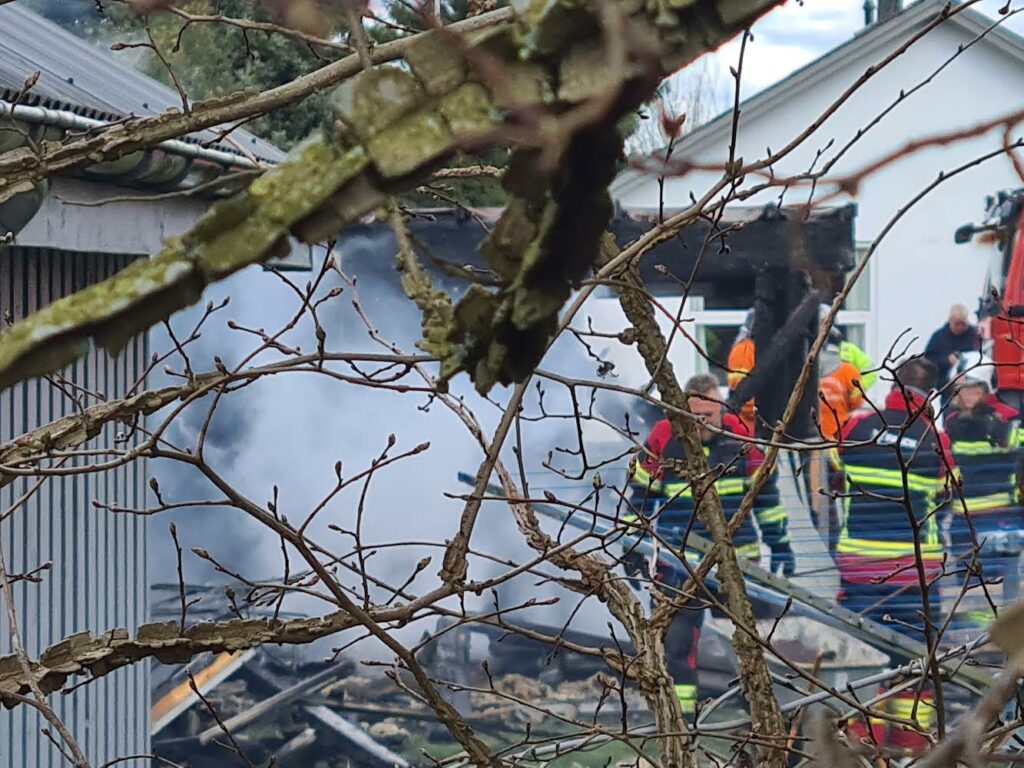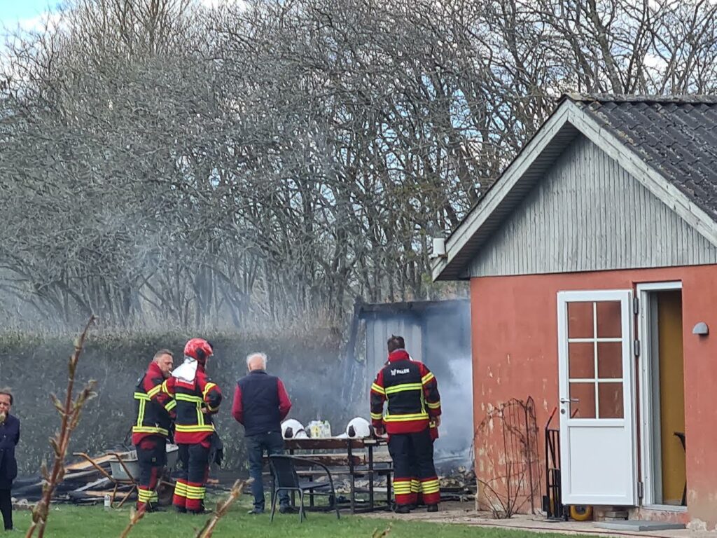 Brandfolkene kæmper med slukningen af branden, som har nedbrændt skuret.