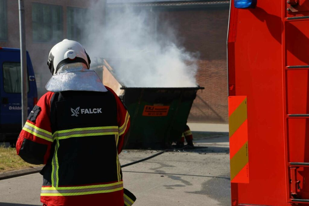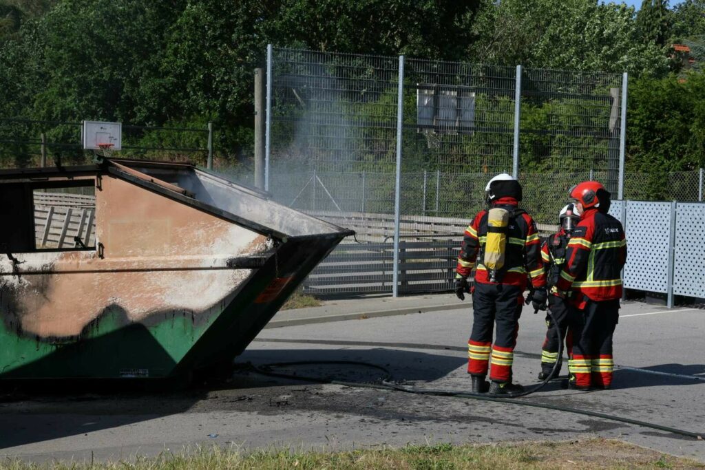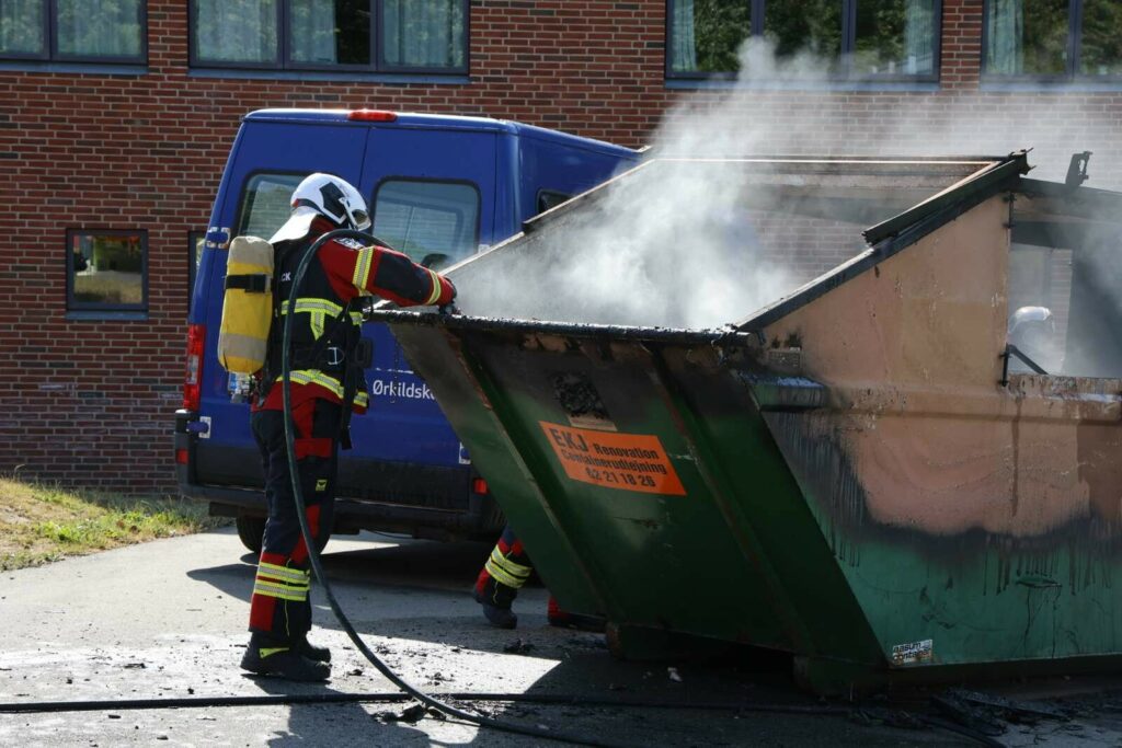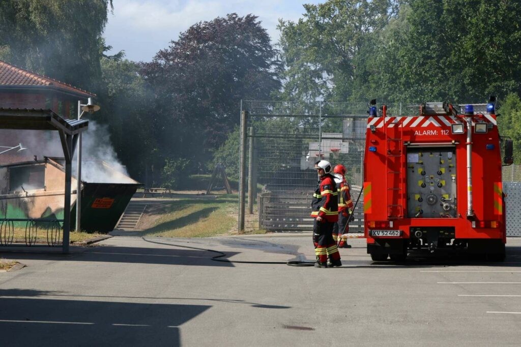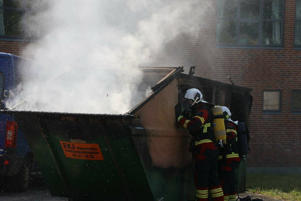 En enkelt brandbil ankom kort efter anmeldelsen til adressen, hvor man kunne konstatere, at der var flammer i en container.