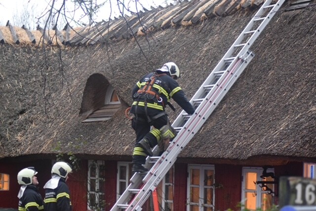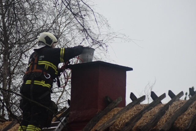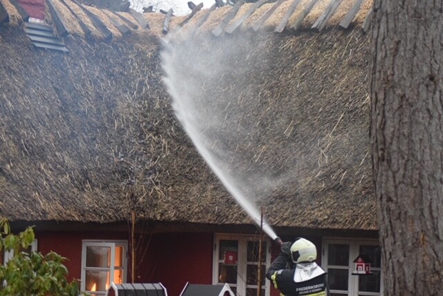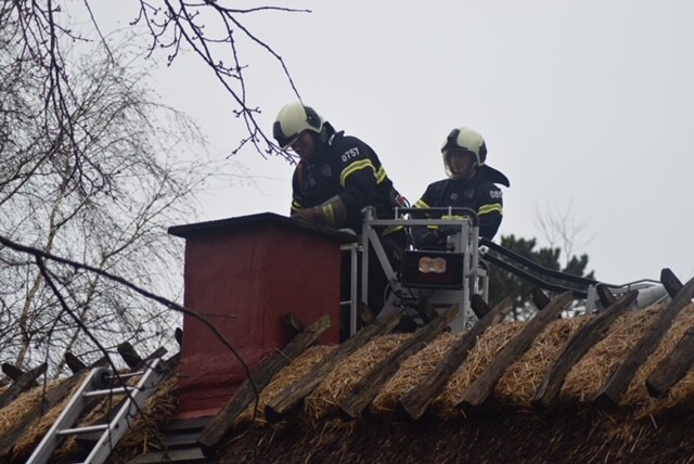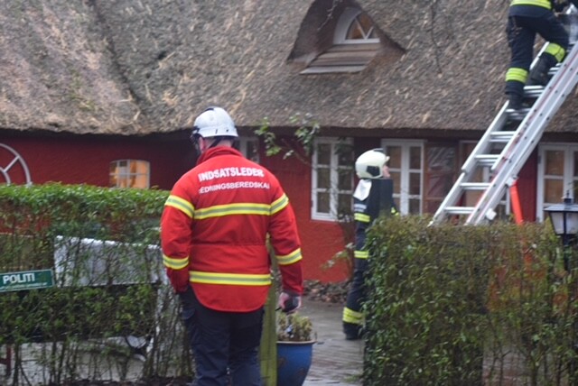 Brandvæsnet er lørdag til stede på Følfodsvej i Hundested, hvor en brand er opstået i en skorsten på en stråtækt bygning hvor brandvæsnet lige nu er i gang med slukningsarbejdet efter at der vælter gløder op fra skorstenen.