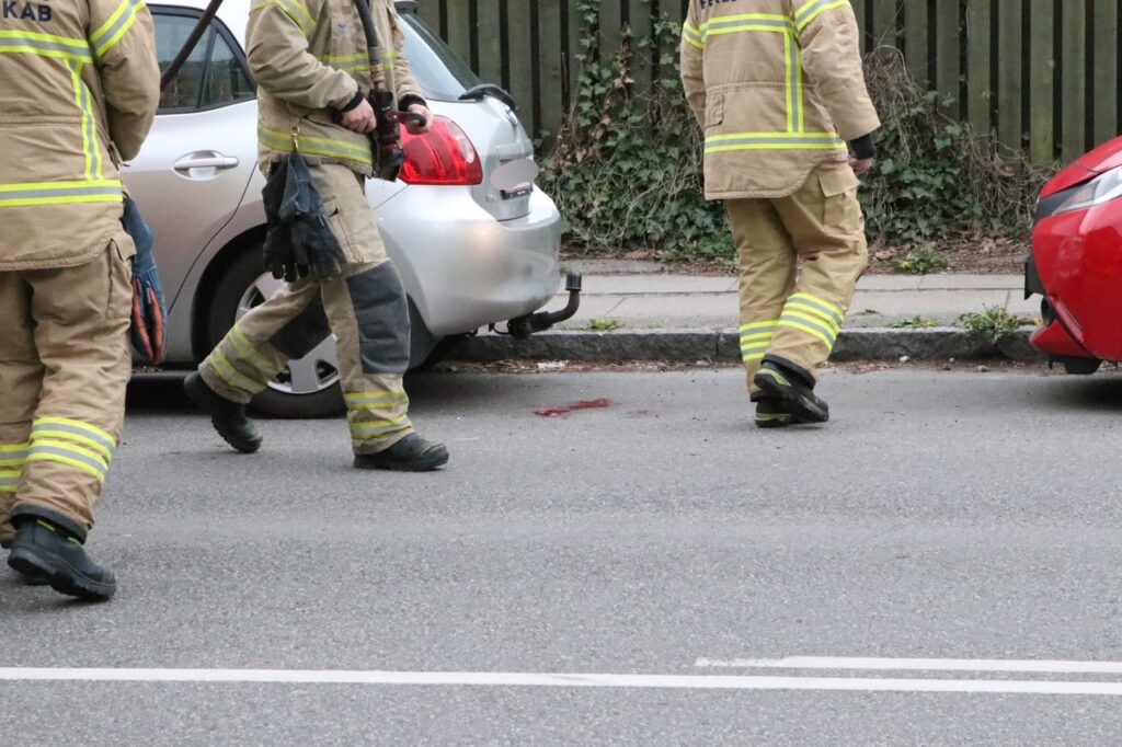 En ulykke er sket på vejen, så brandvæsnet er kaldt ud for at spule vejen ren.
