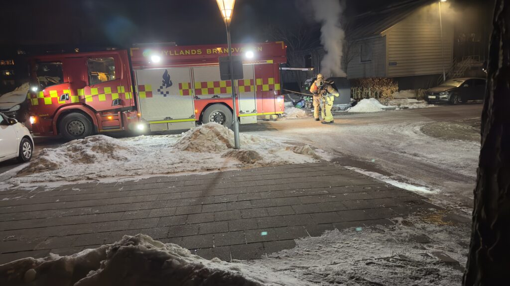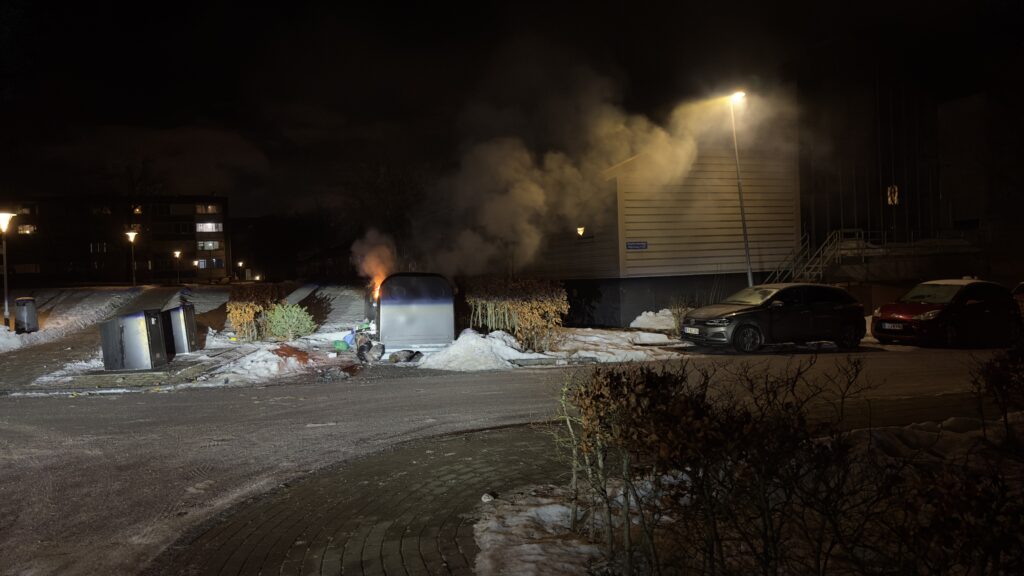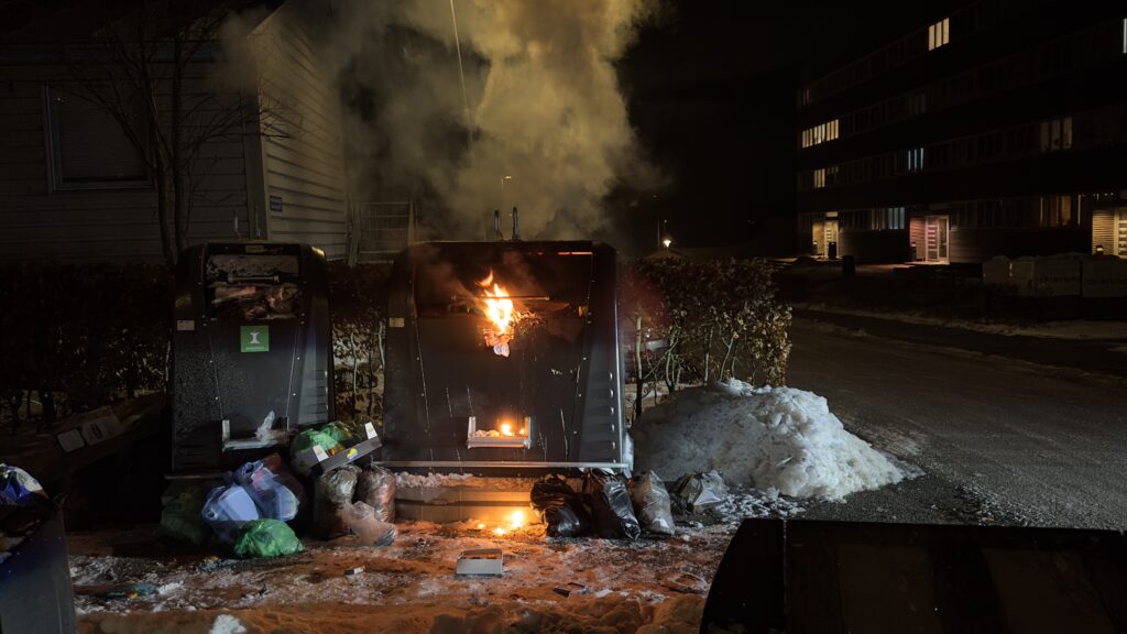 Der flammer i containeren, men branden har ikke fået fat på de nærliggende affaldsbeholdere og skraldet, som ligger ved siden af.