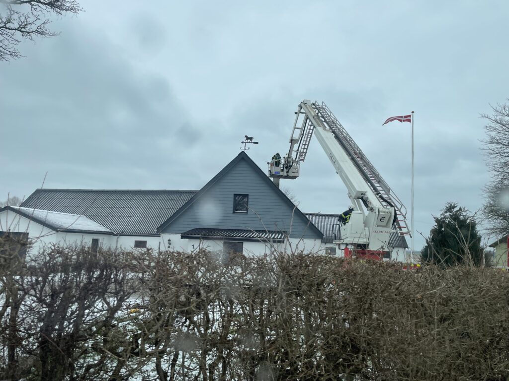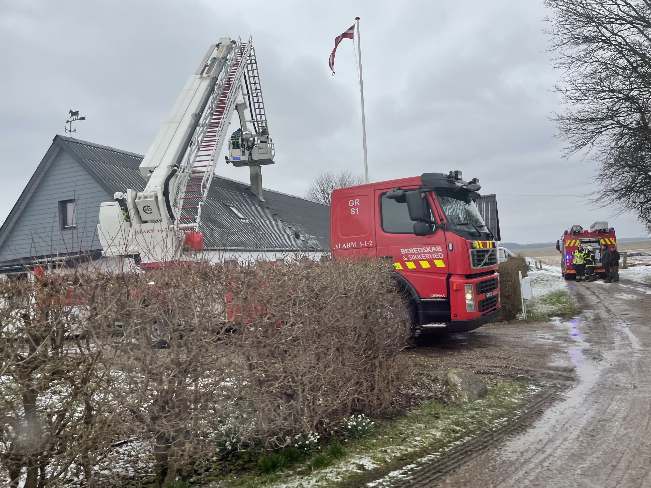 Brandkøreøjer fra Kolind og Grenaa er på stedet, hvor man netop har hejst stigen op til taget for at få det fulde overblik over brand og røg i skorstenen.