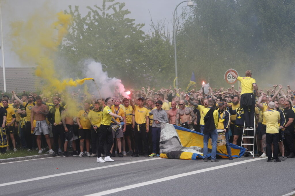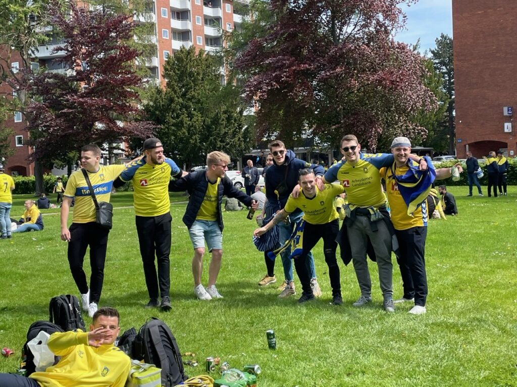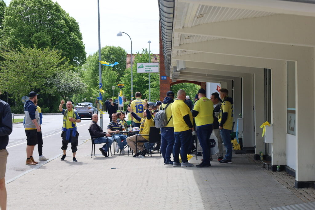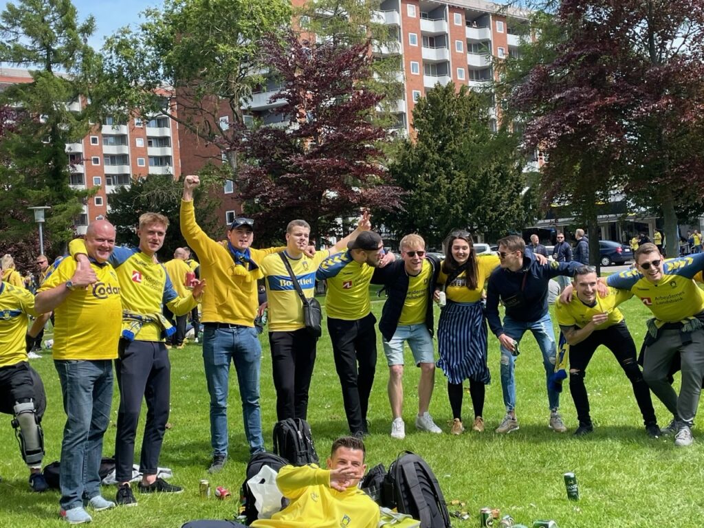 Hundredevis af gulklædte brøndbyfans er mandag eftermiddag samlet i Brøndbyøster forud for eftermiddagens kamp på FC Nordsjælland.