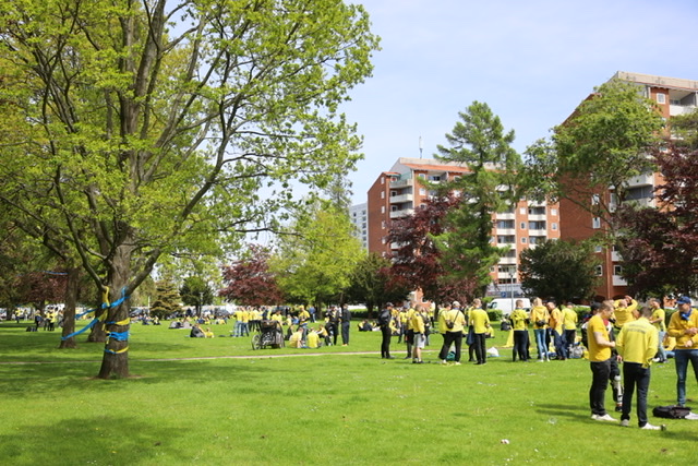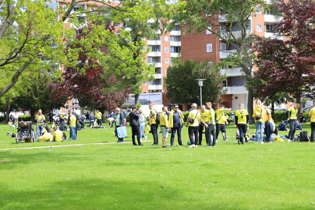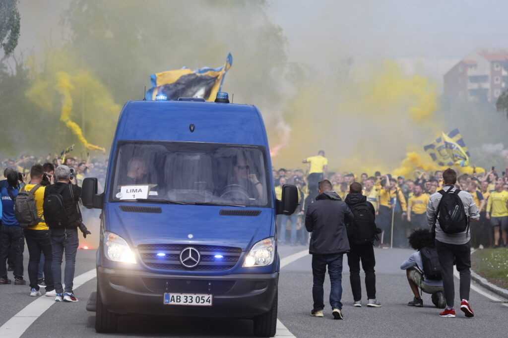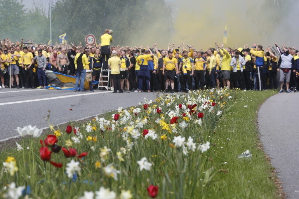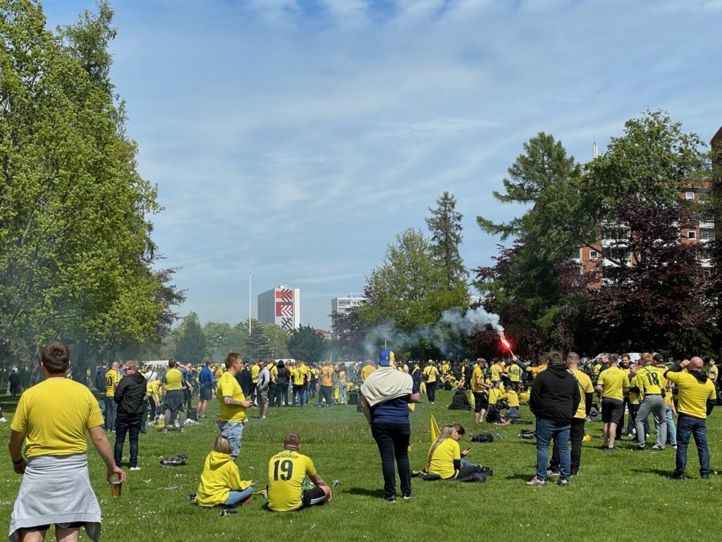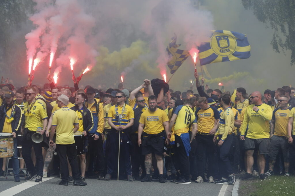 Hundredevis af gulklædte brøndbyfans er mandag eftermiddag samlet i Brøndbyøster forud for eftermiddagens kamp på FC Nordsjælland.