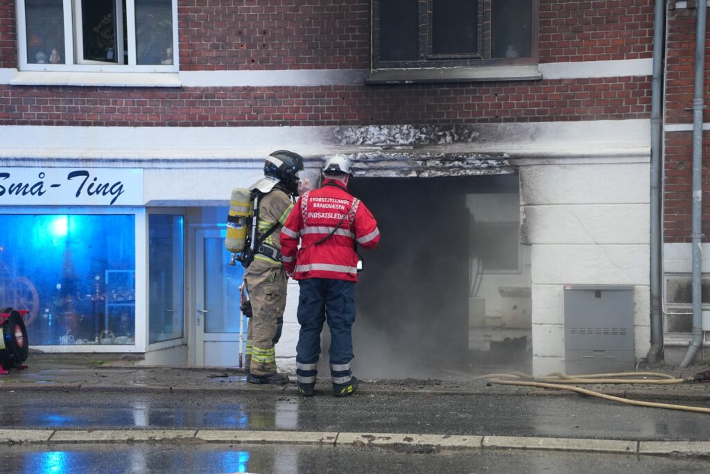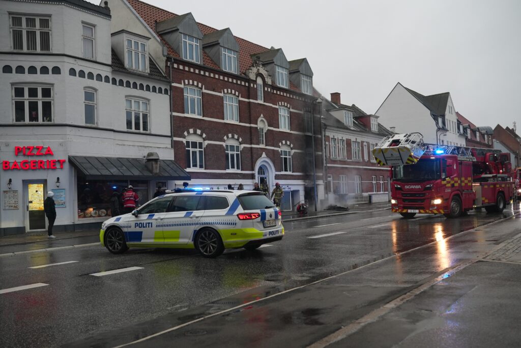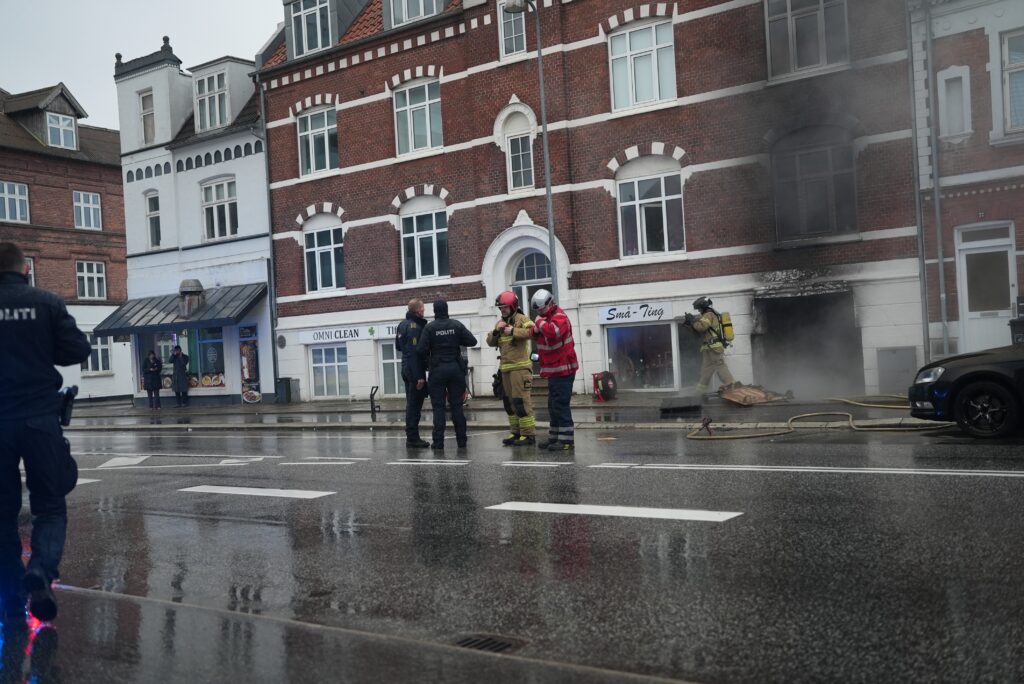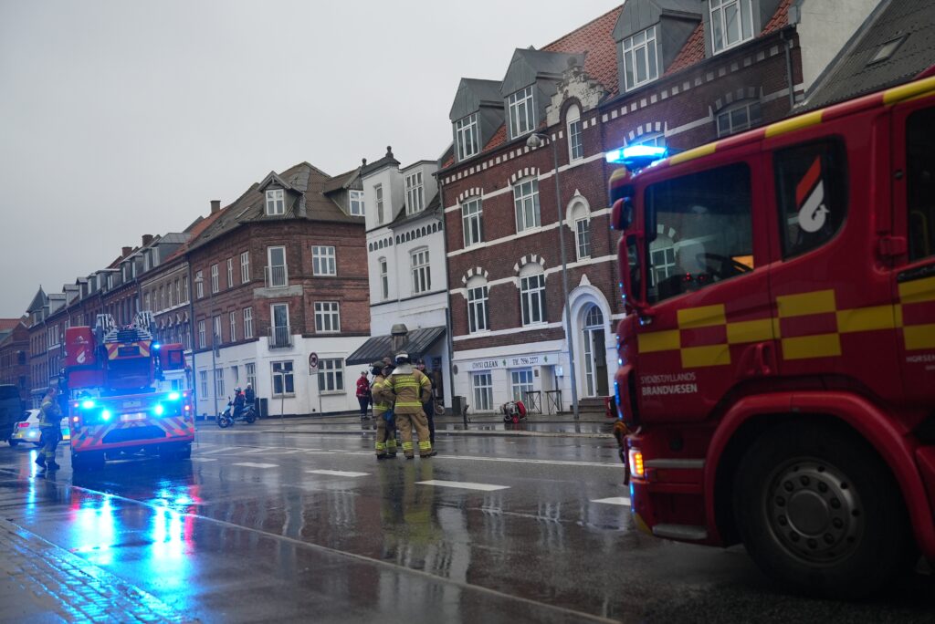 Tidligt søndag formiddag er der tydelig røgudvikling fra en etageejendom ved butikken Små – Ting, der ligger på Sønderbrogade i Horsens.