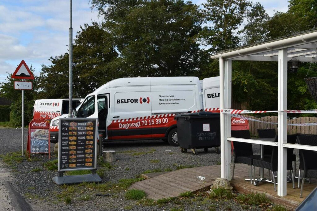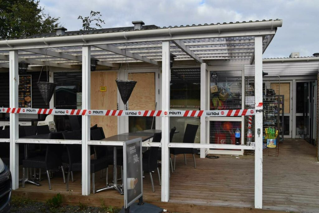 Området omkring et ‘grill-hus’ er afspærret af politiet og skadesservice er fremme for at sikre brandstedet.