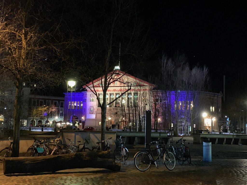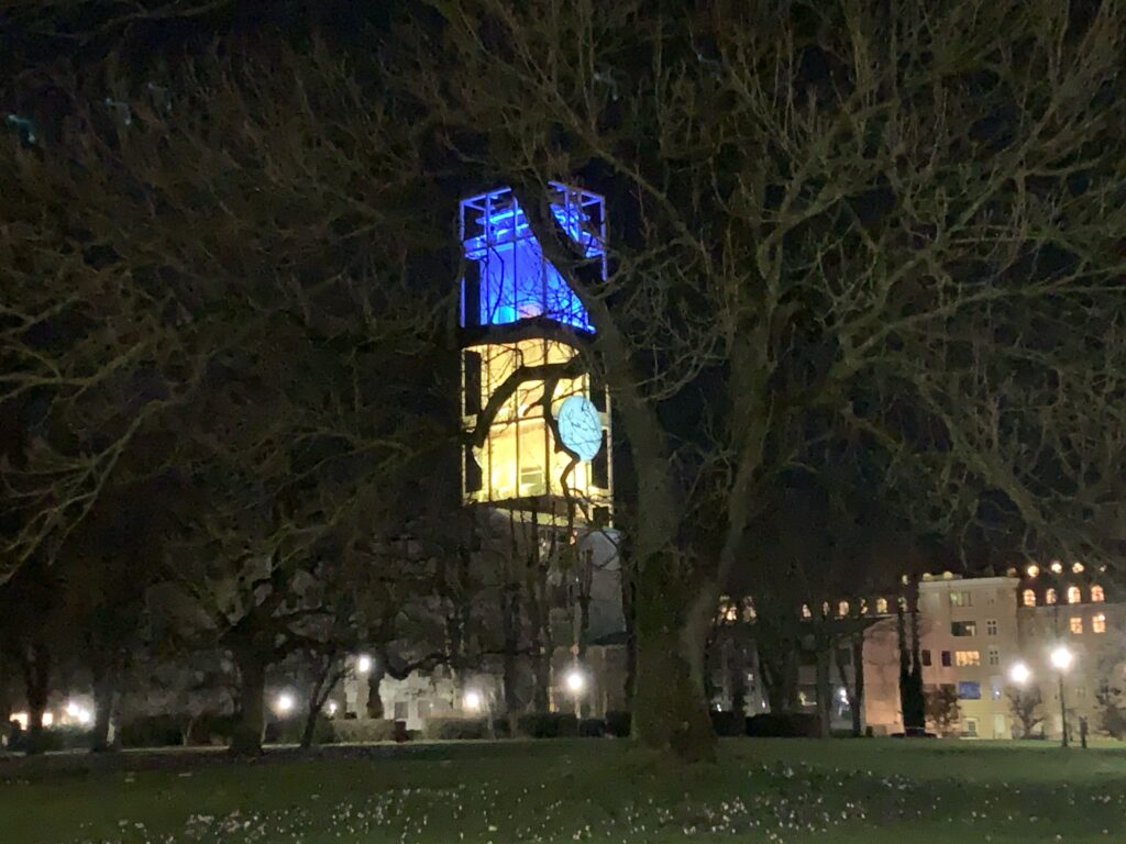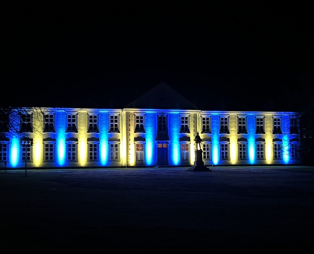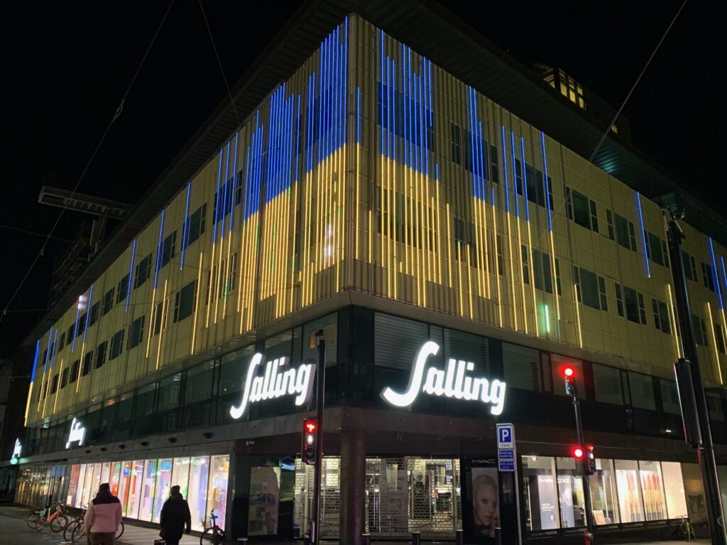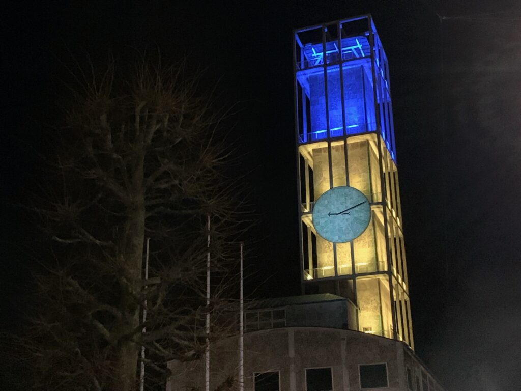 Som mange andre steder i Danmark og i resten af verden, så bliver både monumenter, bygninger og broer lyst op i Ukraines blågule farver.