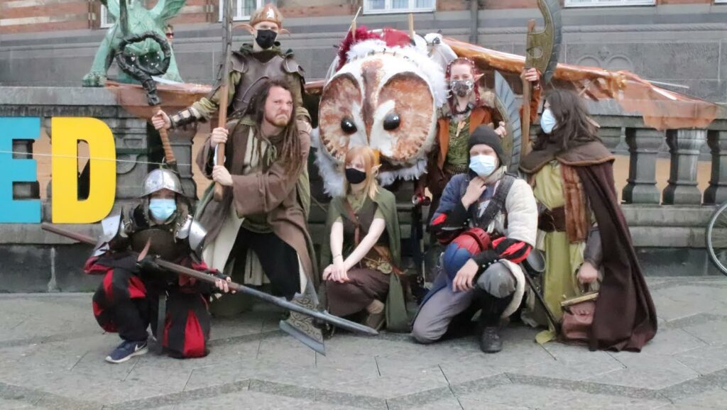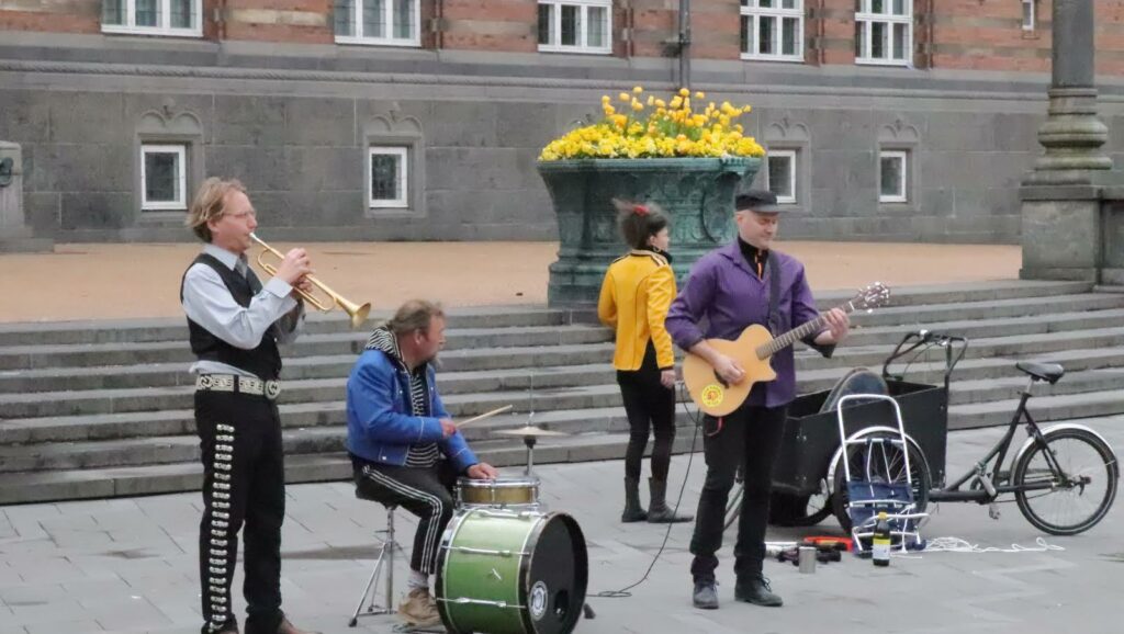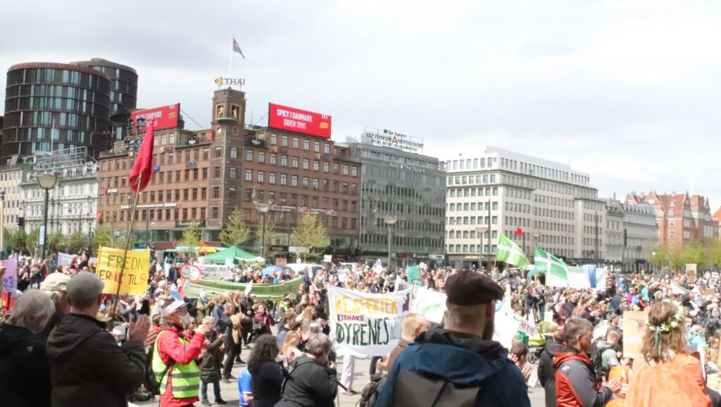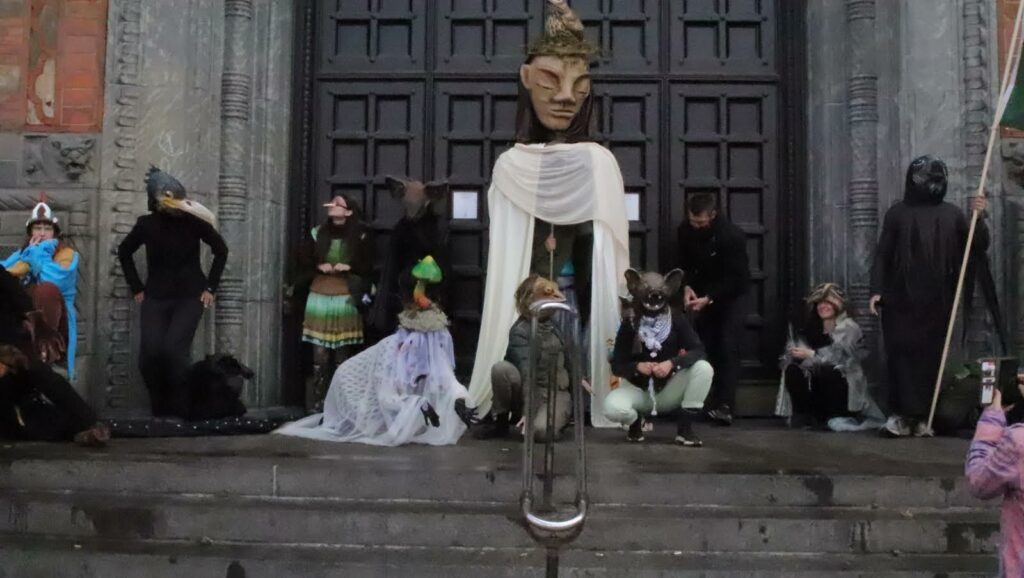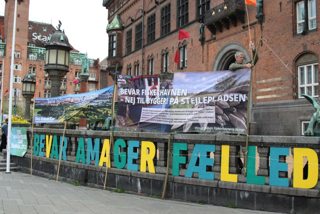 Lørdag middag er Rådhuspladsen i København, pyntet med teksten “BEVAR AMAGER FÆLLED”, bannere med tekst som “Bevar fiskerihavnen – NEJ til byggeri på Stejlepladsen”, store 3D fugle, dans og musik.