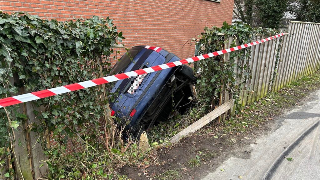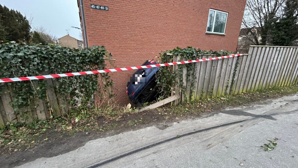 Søndag morgen sidder den forulykkede bil stadig fast mellem bygning og rækværk, men politiet har afspærret stedet. Det er dog uvist, hvornår den vil blive fjernet.