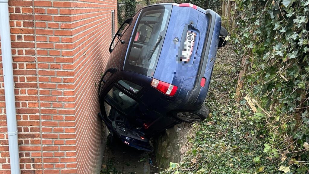 Men den ene bil sad fast, da den kørte gennem rækværket, udover skråningen ved bygningen, hvorefter den var kilet fast mellem skråning og bygning.