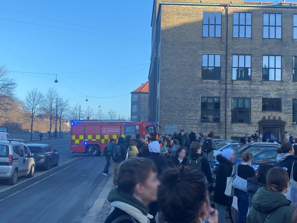 Hovedstadens Beredskab er til stede på skolen og undersøger om der er tale om en reel brand, eller om det bare er en falsk alarm.