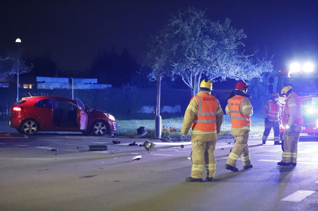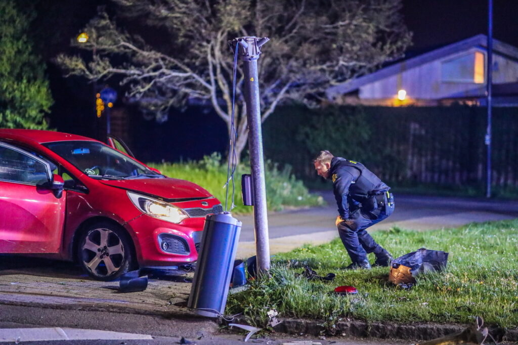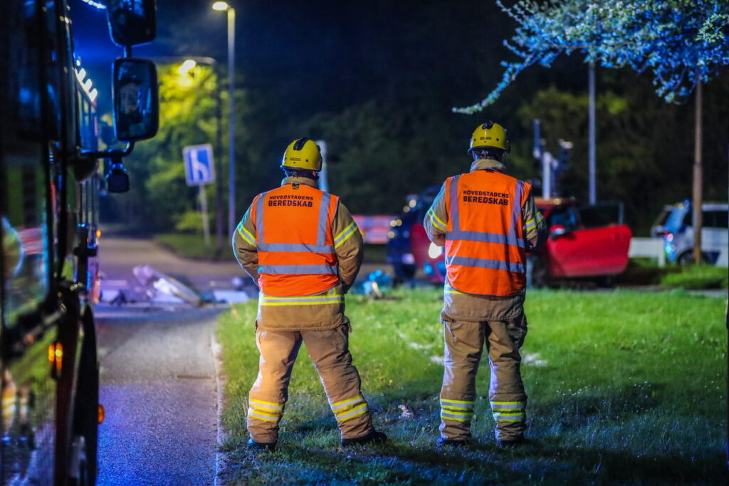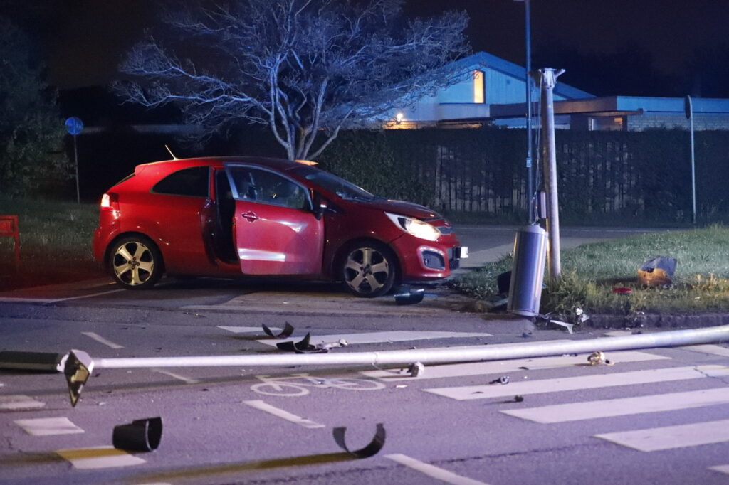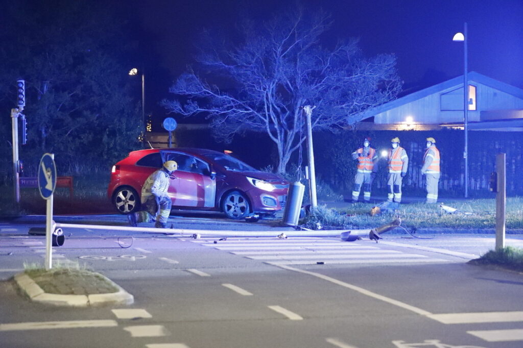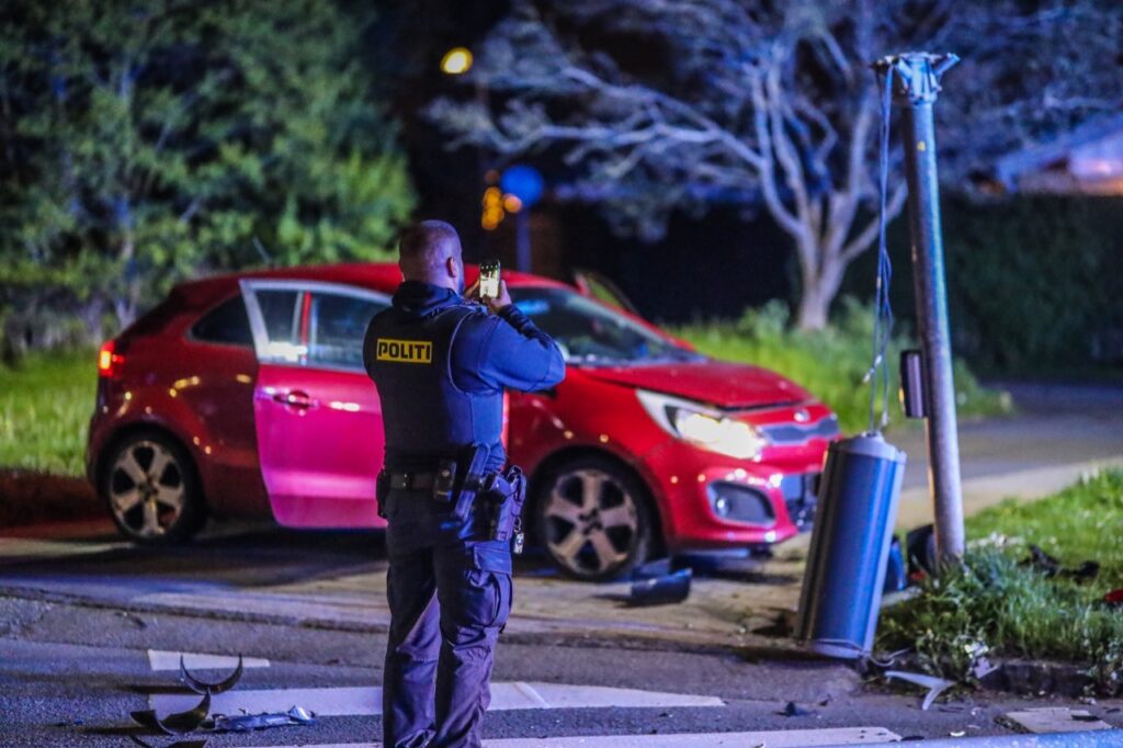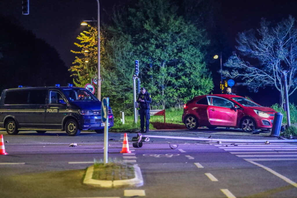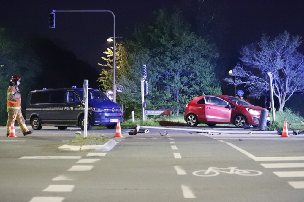 En mindre personbil har påkørt en lygtepæl og et lyssignal og efterfølgende havnet inde på cykelstien.