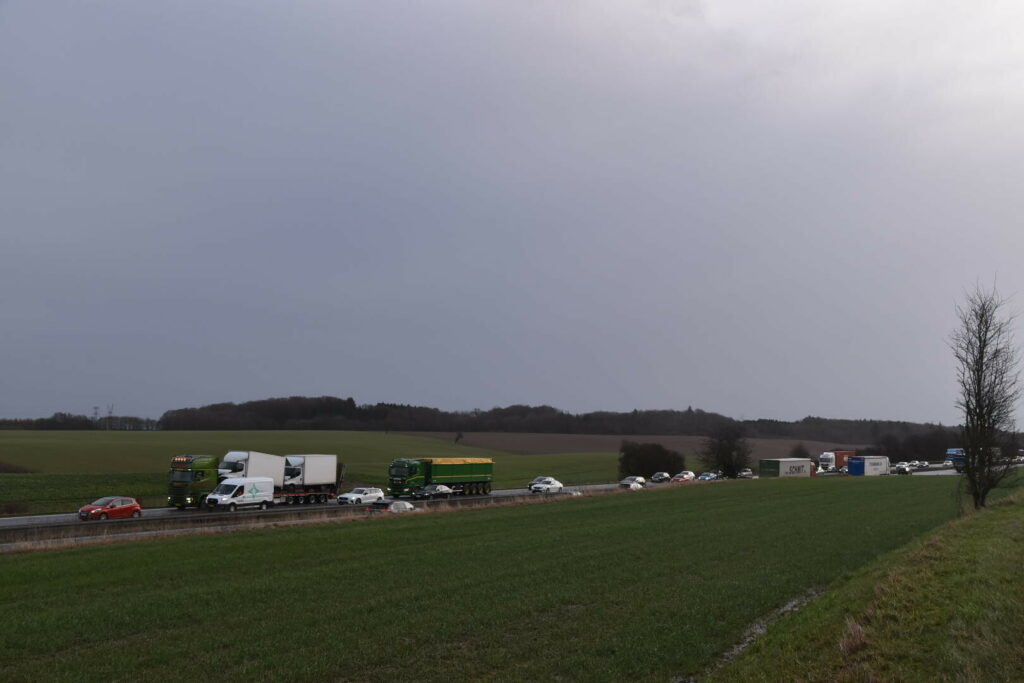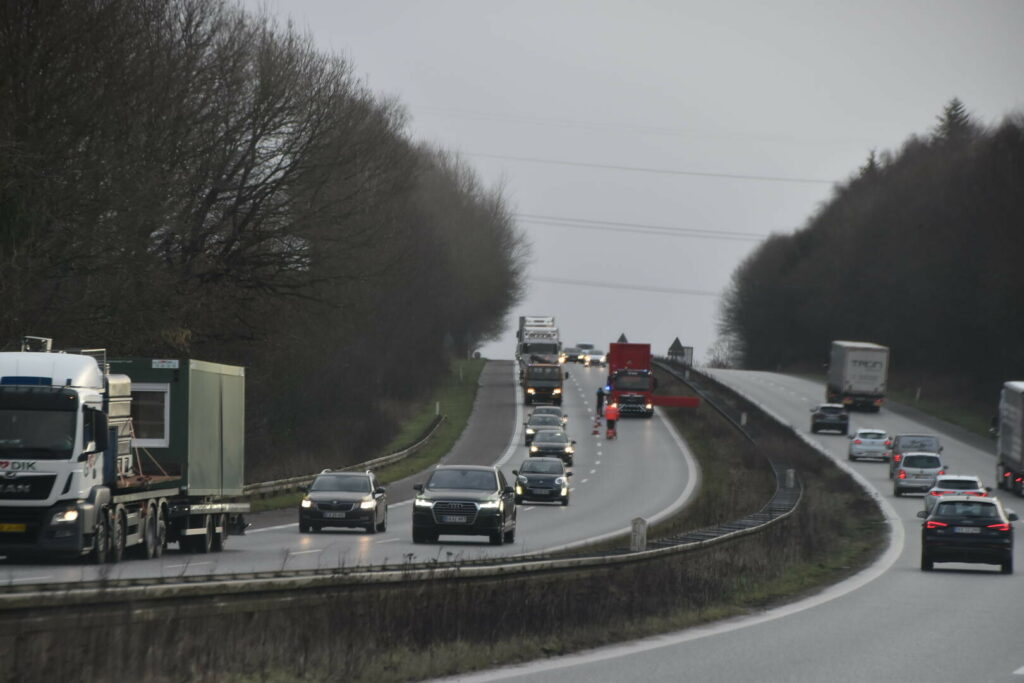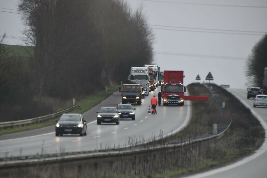 Ifølge Vejdirektoratet er kun ét spor farbart efter uheldet, hvilket har skabt en del kø på strækningen. Der forventes at være ryddet omkring klokken 09.