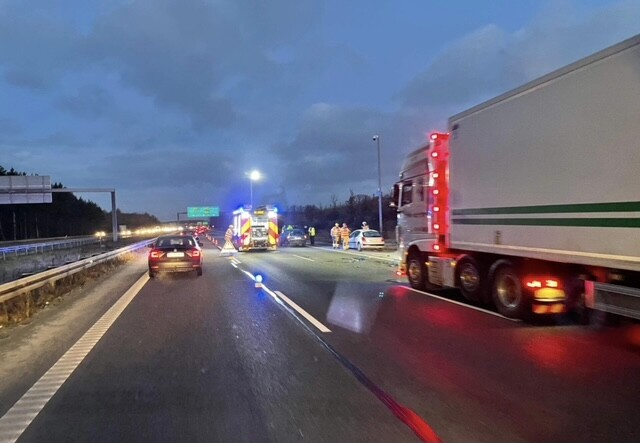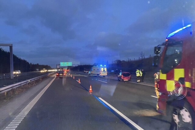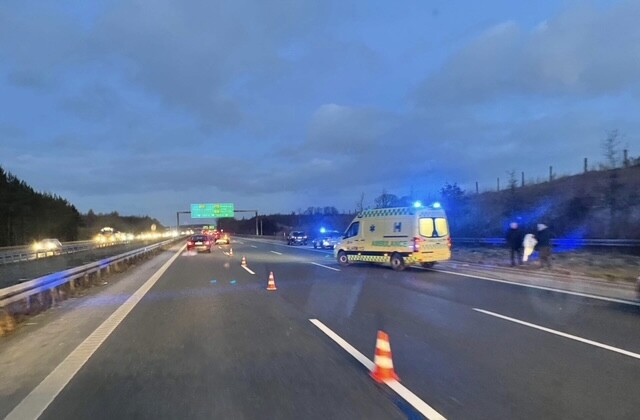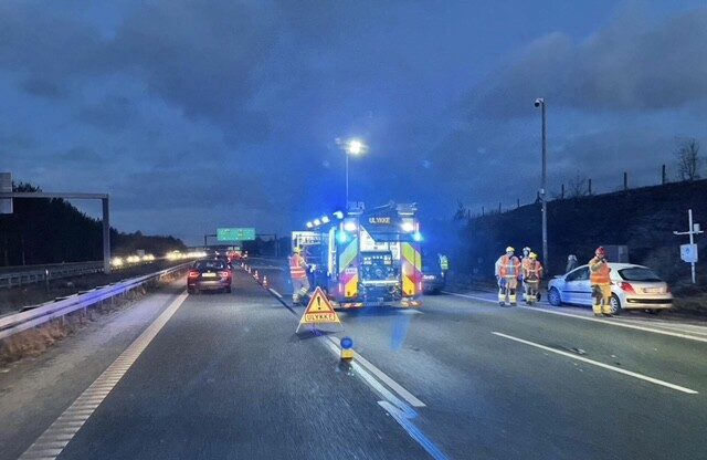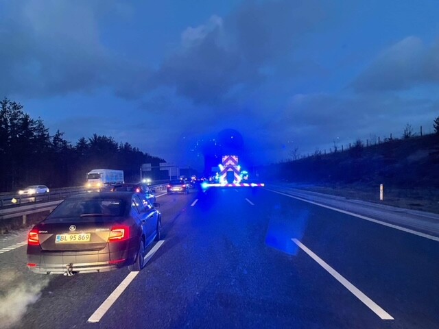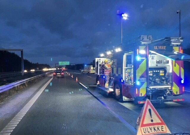 Redningsmandskabet er talstærkt til stede, og motorvejen er delvist spærret.