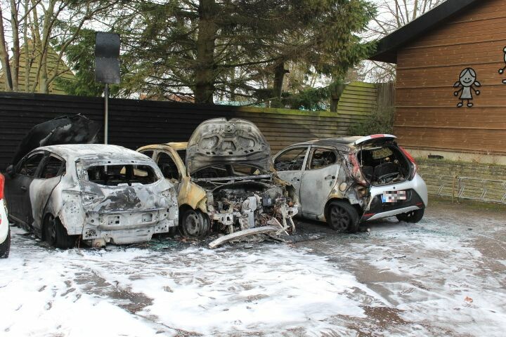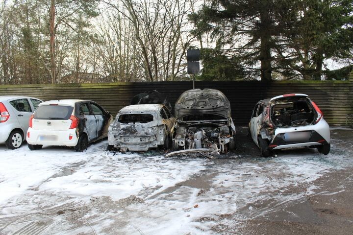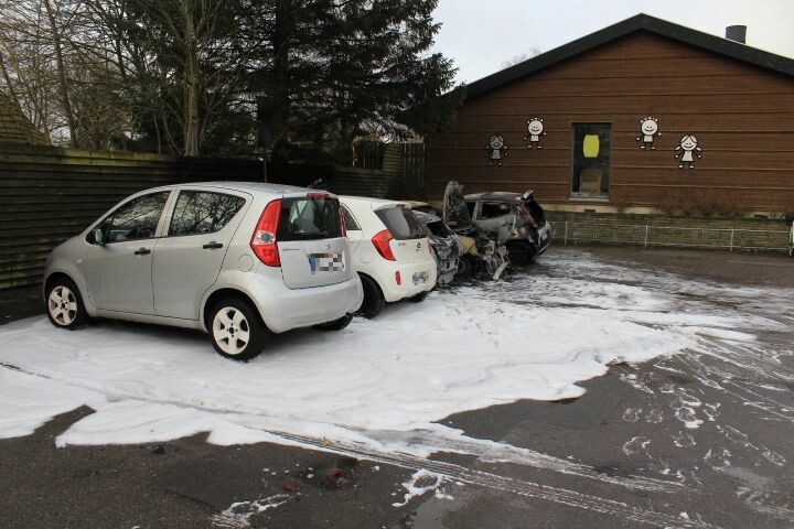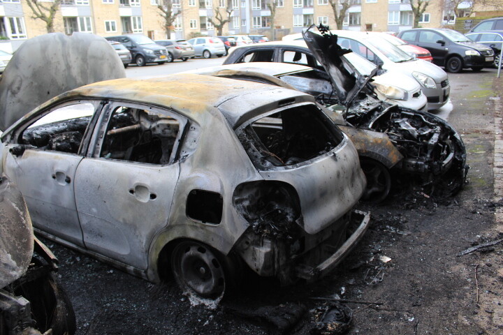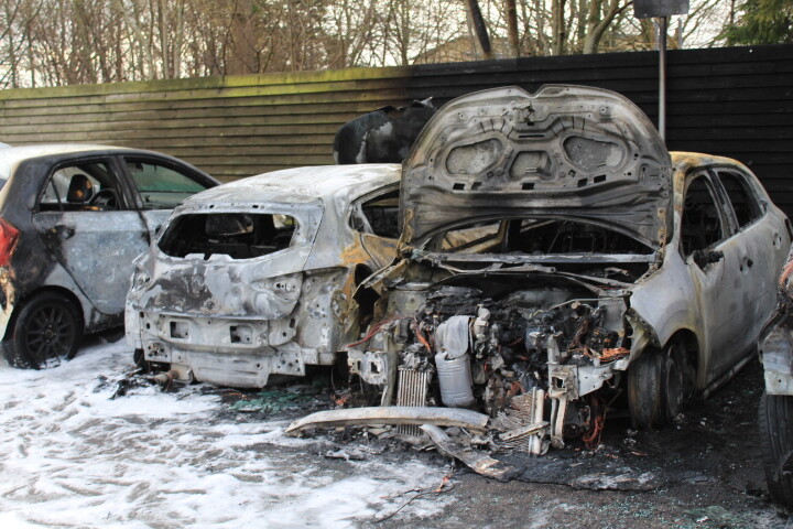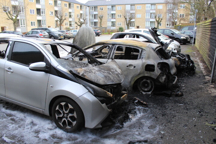 Tre personbiler er brændt ud og en fjerde bil har store skader efter en brand på Lilletoften i Ballerup i nat.