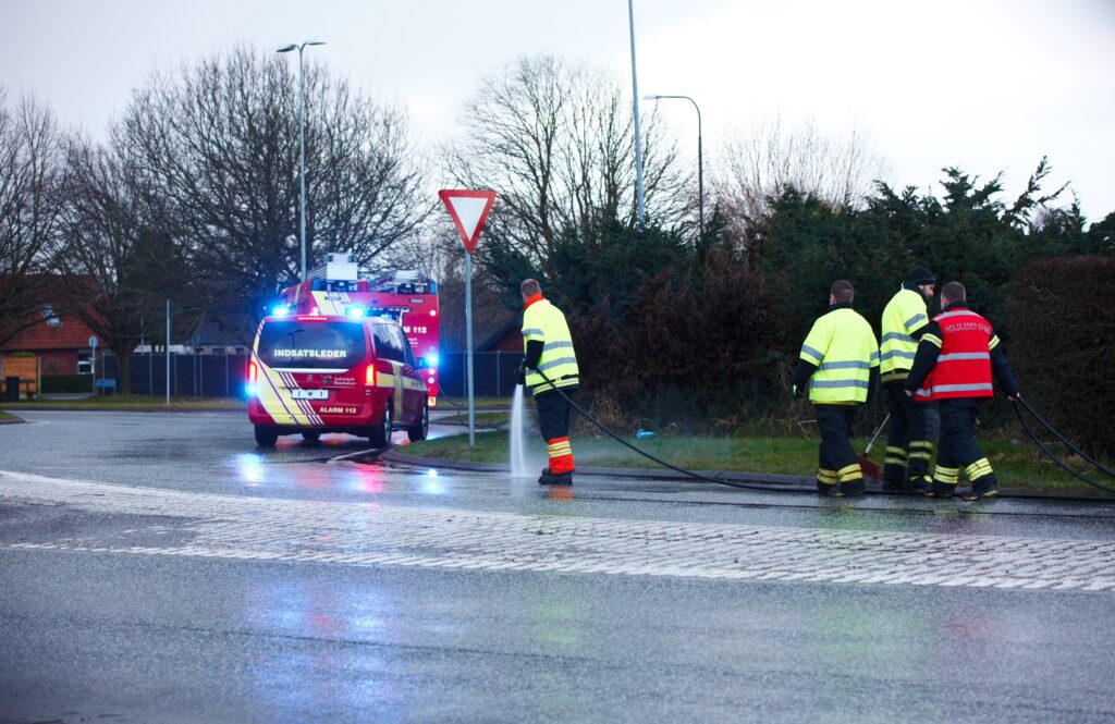 Sydvestjysk Brandvæsen blev lørdag kaldt til et mindre oliespild i en rundkørsel i Stormgade i Esbjerg.