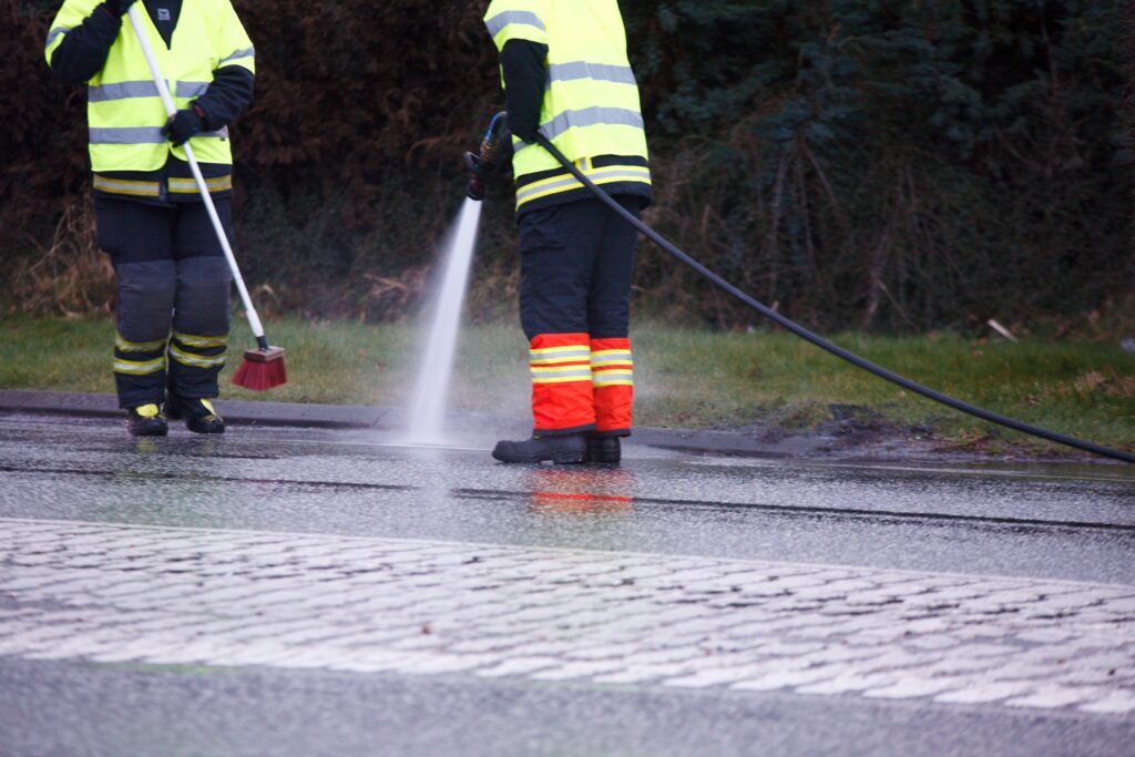 Oprydningsarbejdet er i gang på stedet hvor brandvæsnet fik spulet vejene rene.