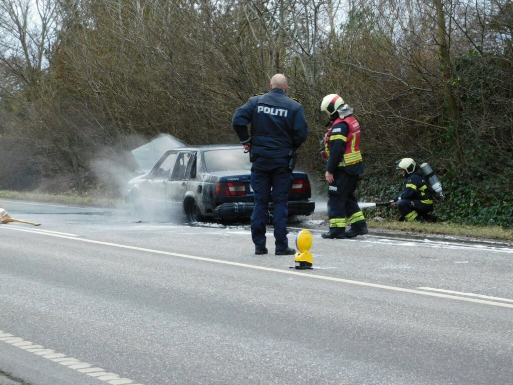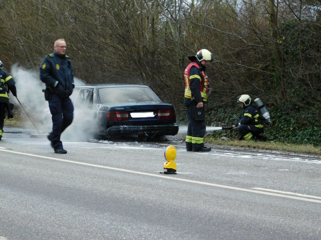 Volvoen endte med at få store skader af flammerne – køretøjet står nu brændt tilbage gennemvædet af vand og skum i siden af vejen.