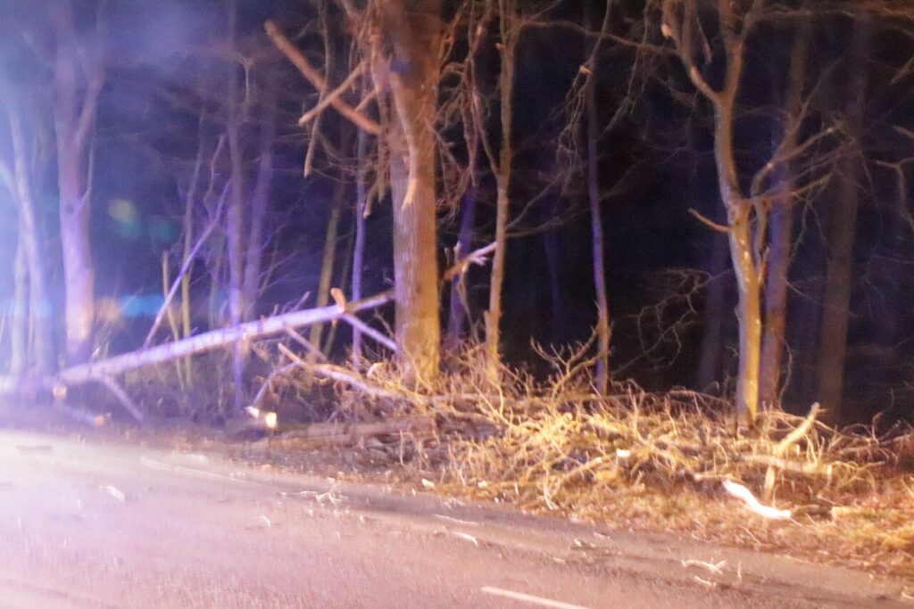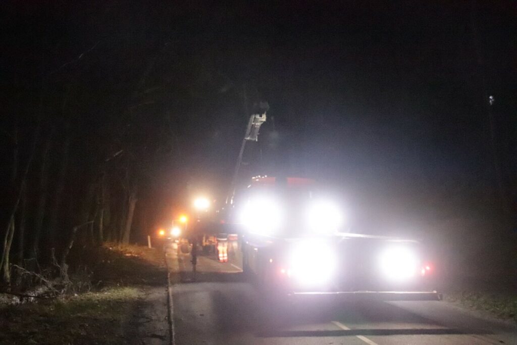 Beredskabet er ved at fjerne grene fra et træ på Hemmedvej ved Glesborg.