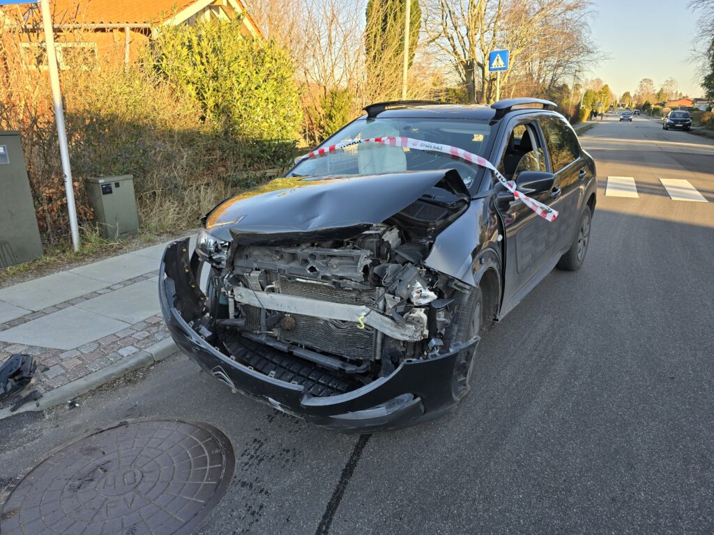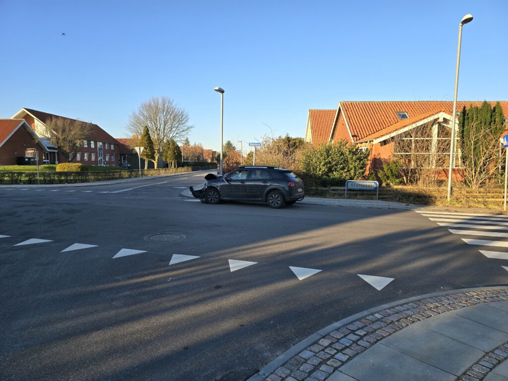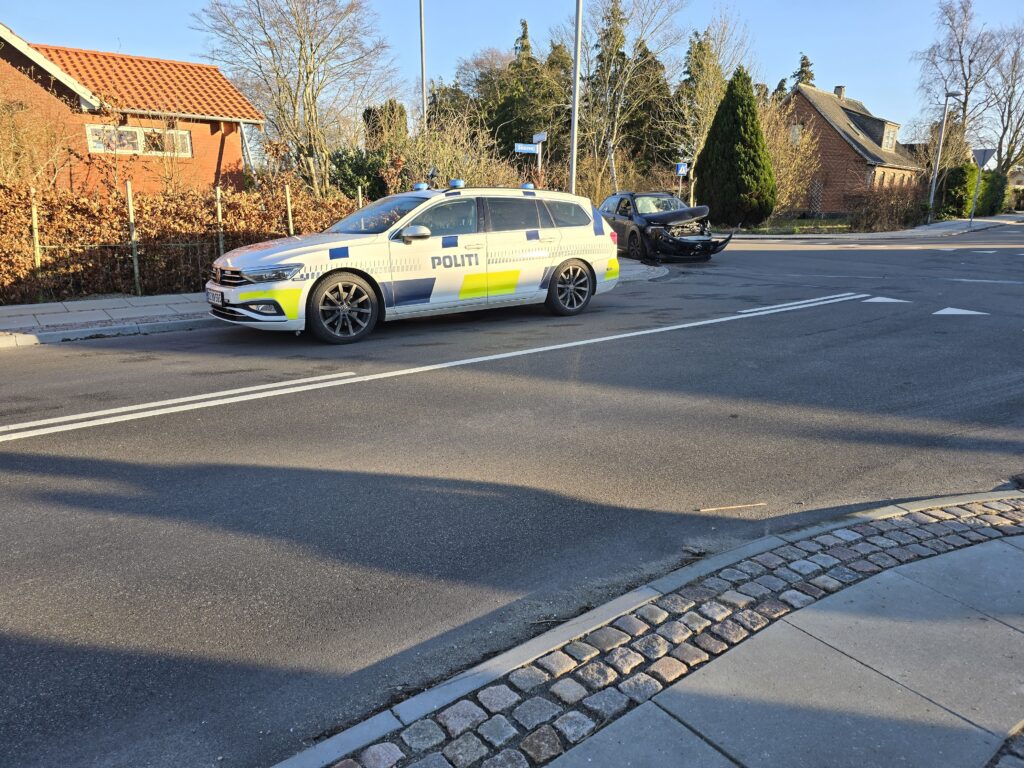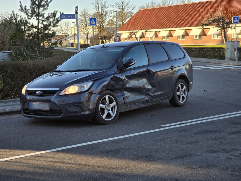 Her er en personbil kørt ind i siden på en anden med store materielle skader til følge.