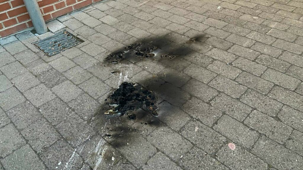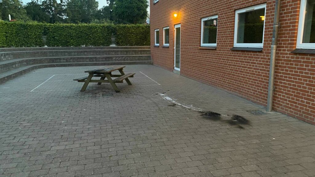 En mindre brand var blevet tændt på et bord som er stående i en gård på skolen.