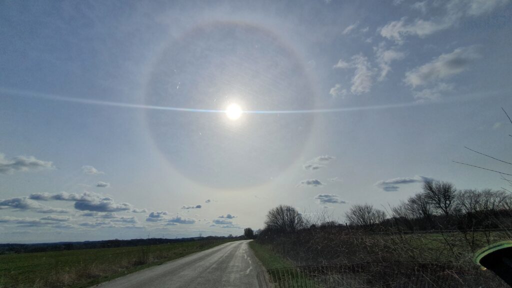 Når solens stråler rammer iskrystallerne i skyerne, spredes lyset, og der dannes derved en ring rundt om solen.