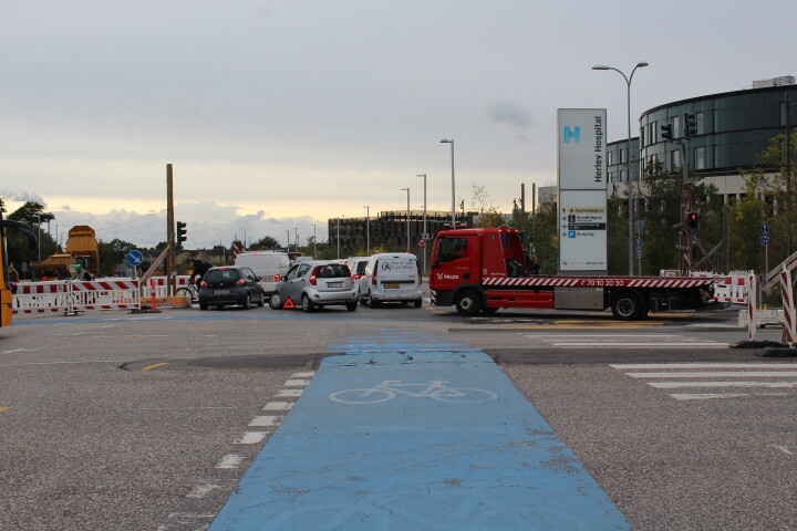 En bil er gået i stå midt krydset ved Herlev Hospital, og er i gang med at få hjælp fra Falck. Derfor er der lige nu en meget tæt kø lige ude foran hospitalet, hvor en masse biler holder og venter på, at den havarede bil bliver hjulpet op på ladet.