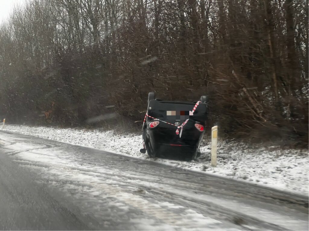 Bilen er endt på taget hvor den er gledet i glatføre.