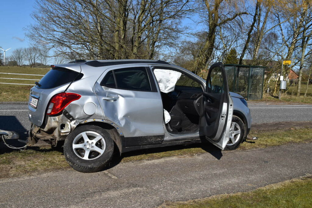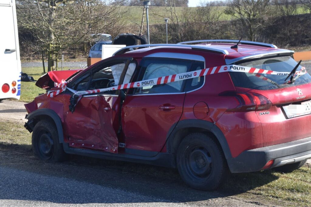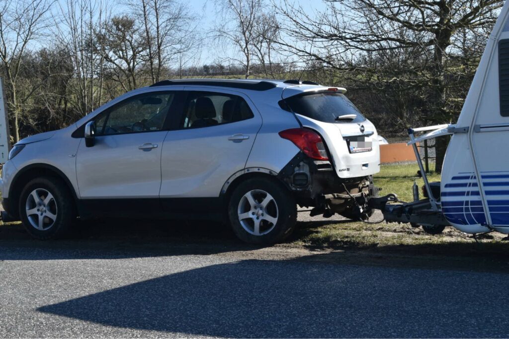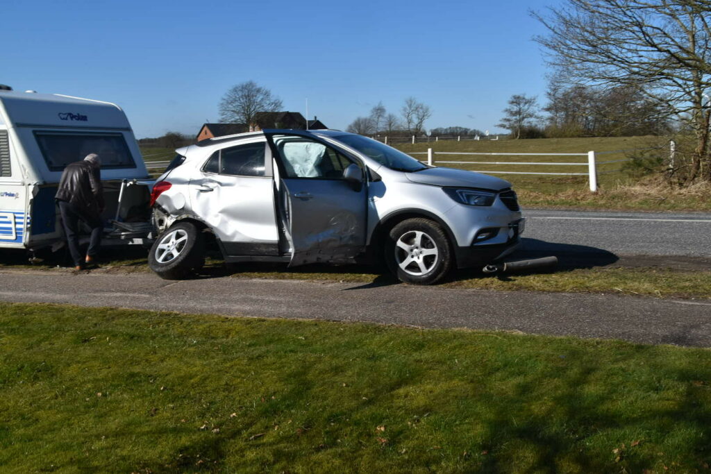 To biler, et skilt og en campingvogn er involveret i uheldet.