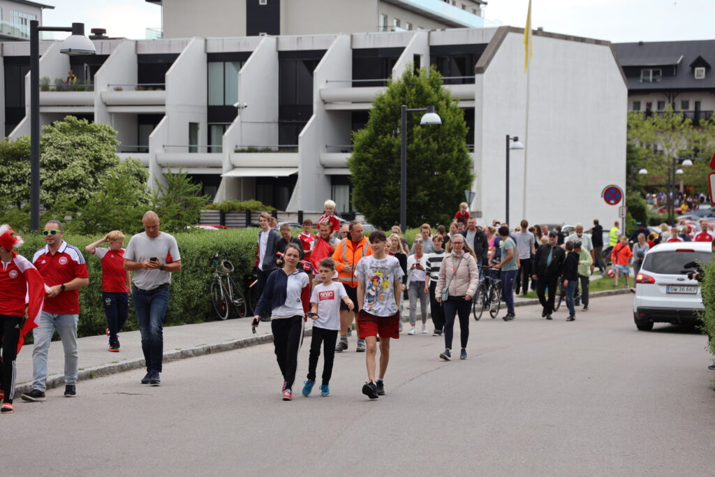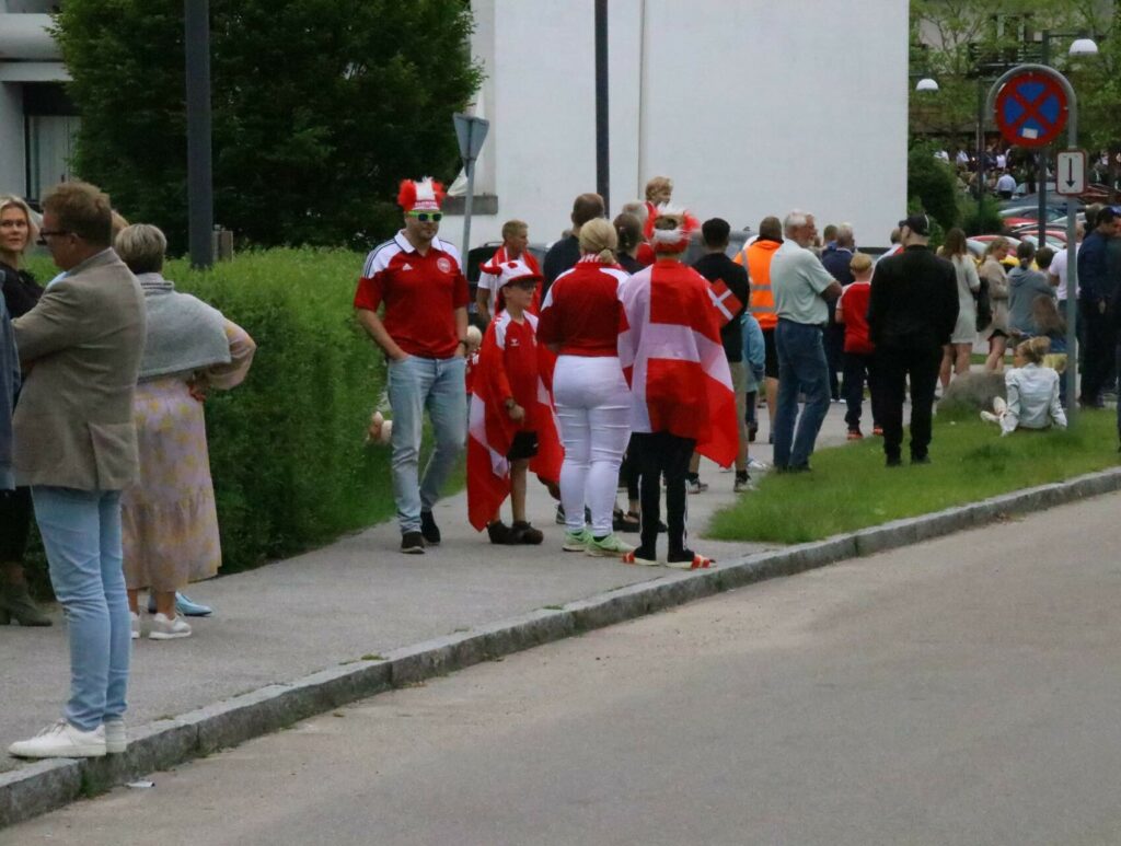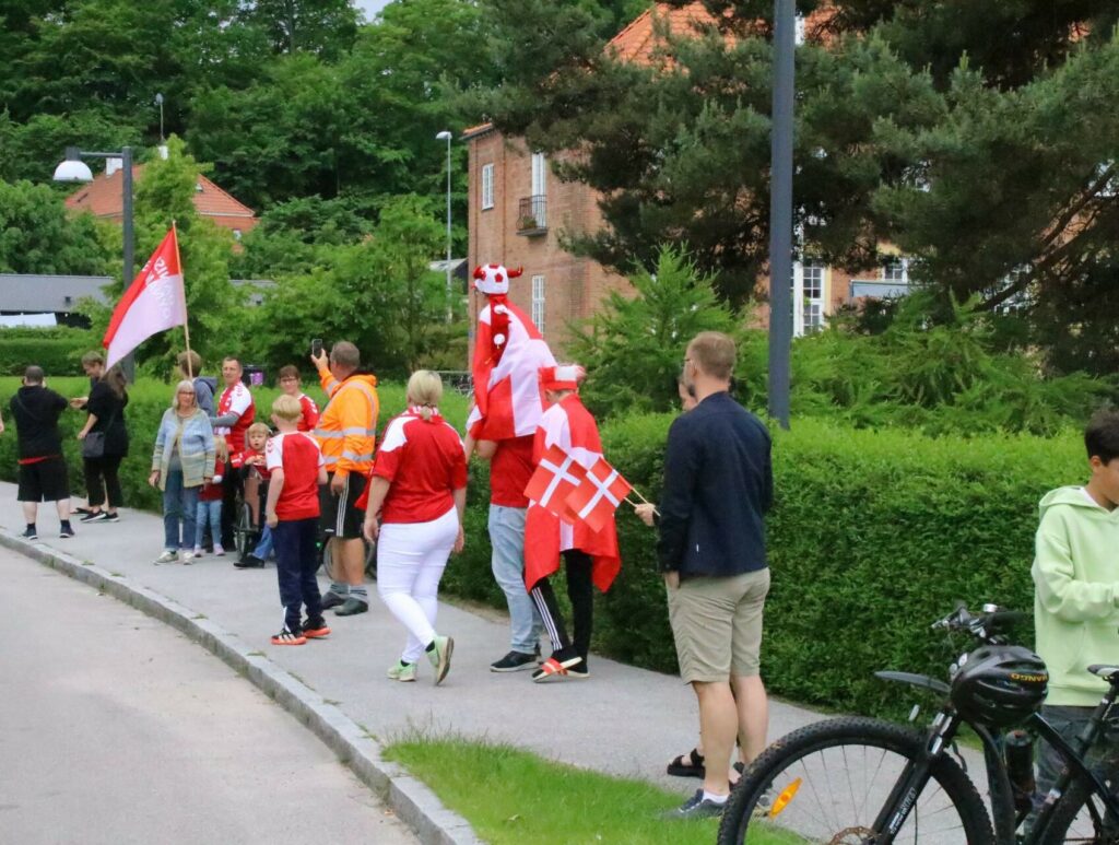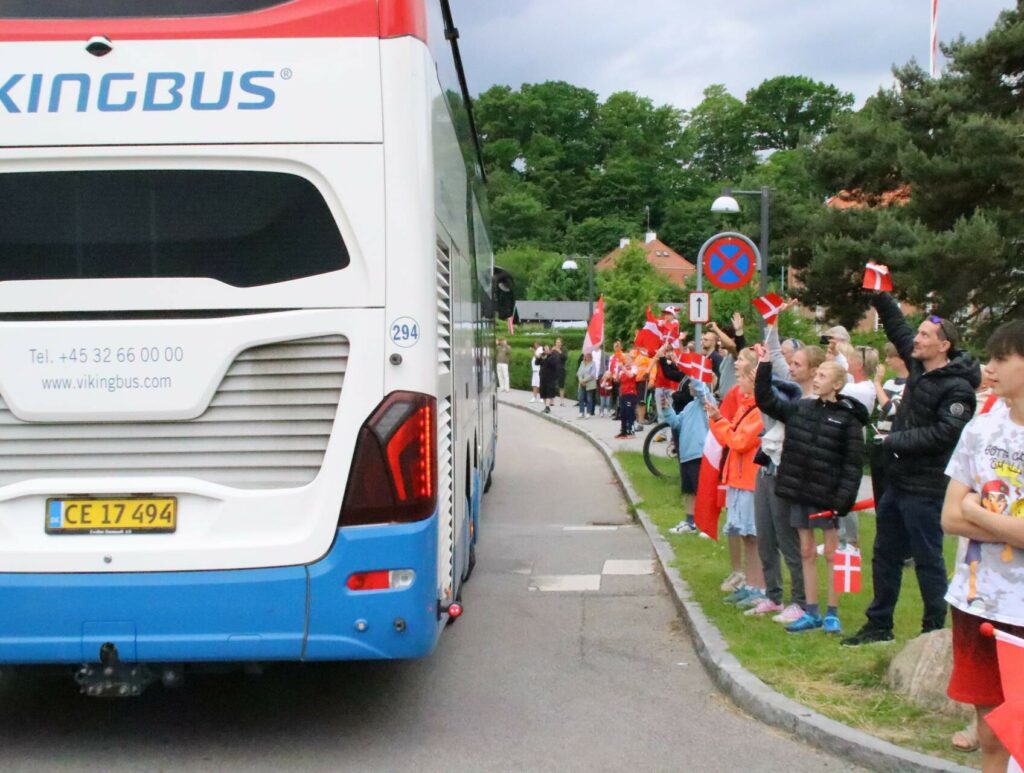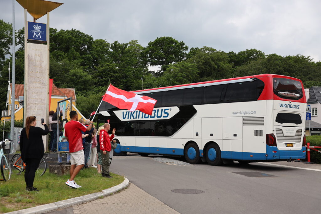 Mange danske fodboldfans var mødt frem med både dannebrog og landsholdstrøjer, som de sendte landsholdsbussen af sted med mod nationalarenaen i København.