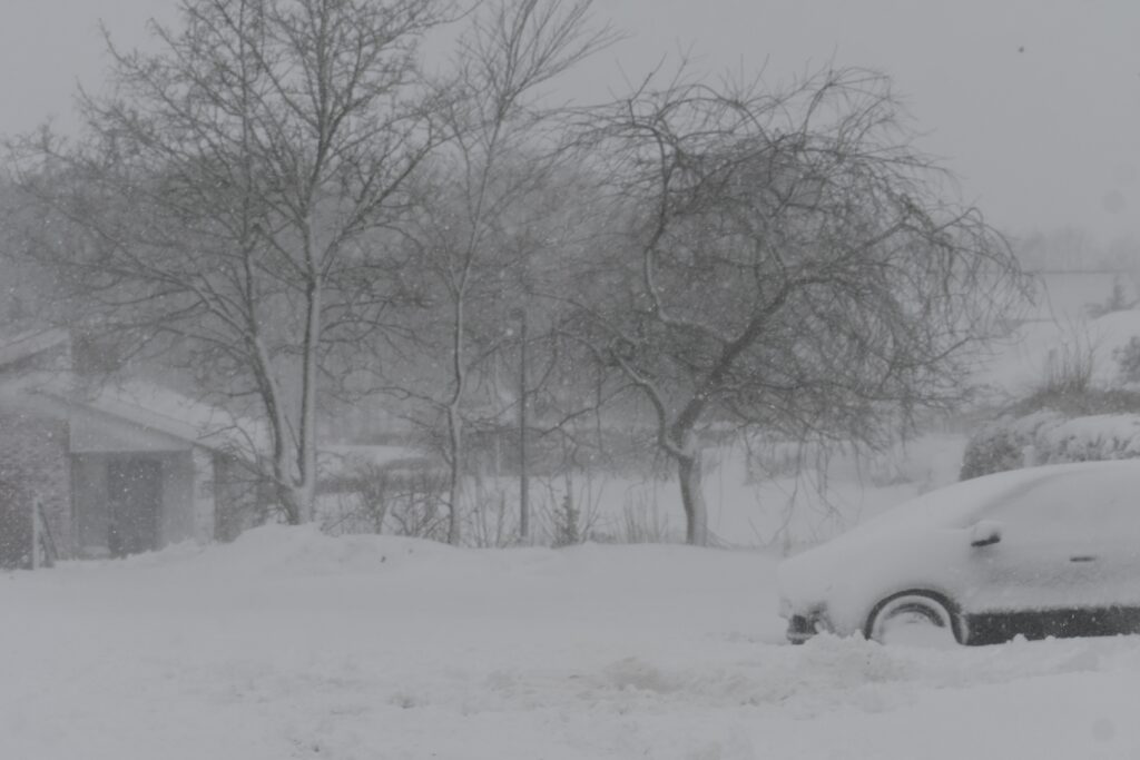 Vejhjælpen og saltsprederne er på overarbejde, men det er svært at følge med den stærke storm, der allerede har lagt det meste af landet ned. Som det tydeliggøres på billederne er hele landsskabet dækket i hvidt grundet i store mængder sne.