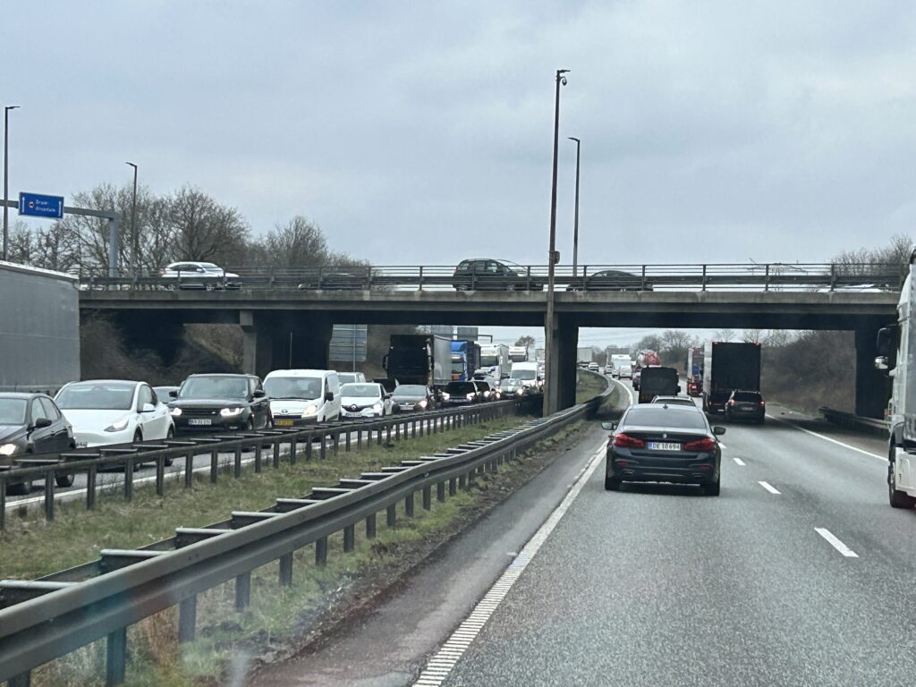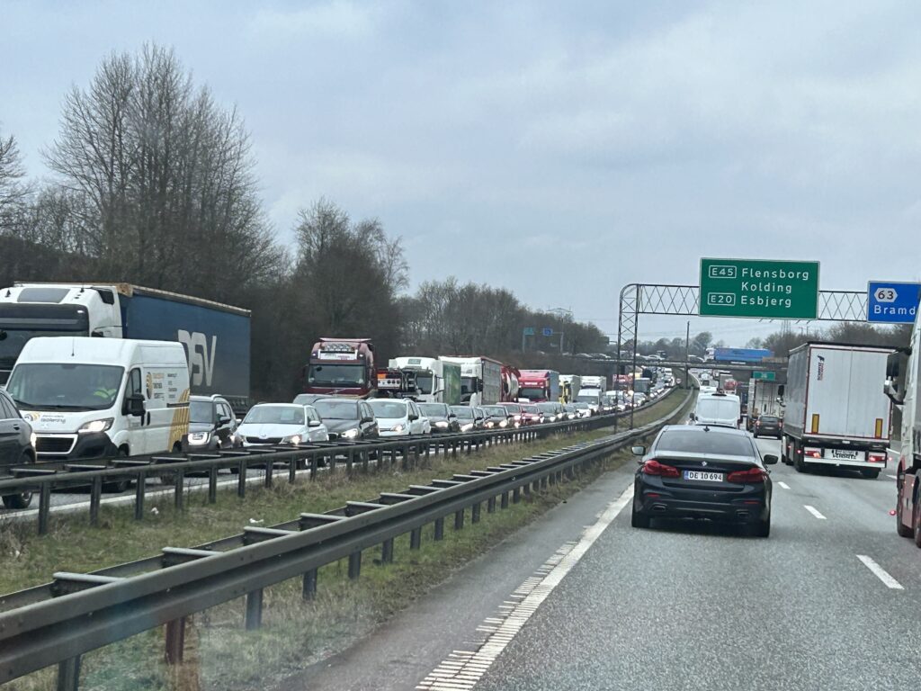 Onsdag eftermiddag er der massiv kø på motorvejen da frakørslen på Sønderjyske Motorvej mod Aarhus frakørsel <62> Kolding Ø er blevet spærret.