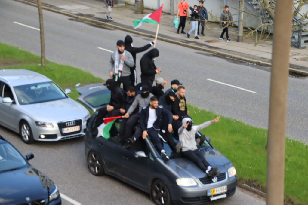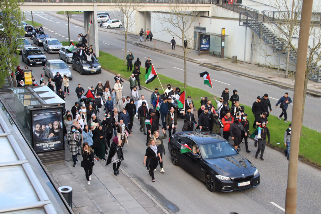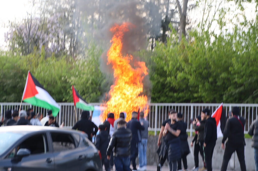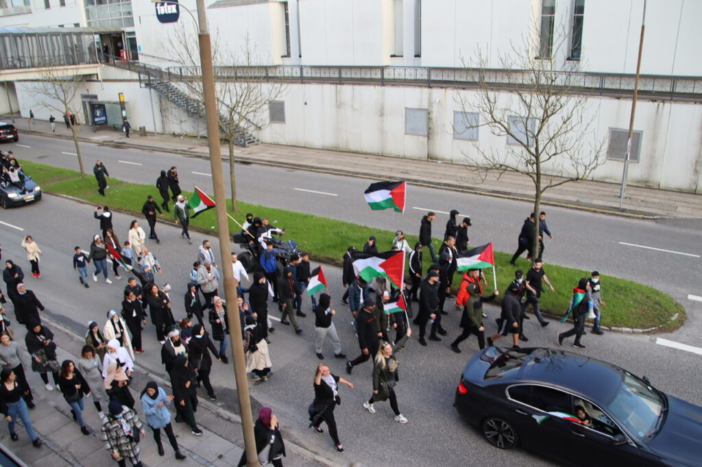 Det israelske flag er blevet brændt af og en stor gruppe mennesker går gennem byen med Palæstina flag.