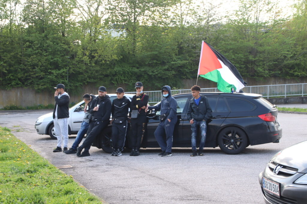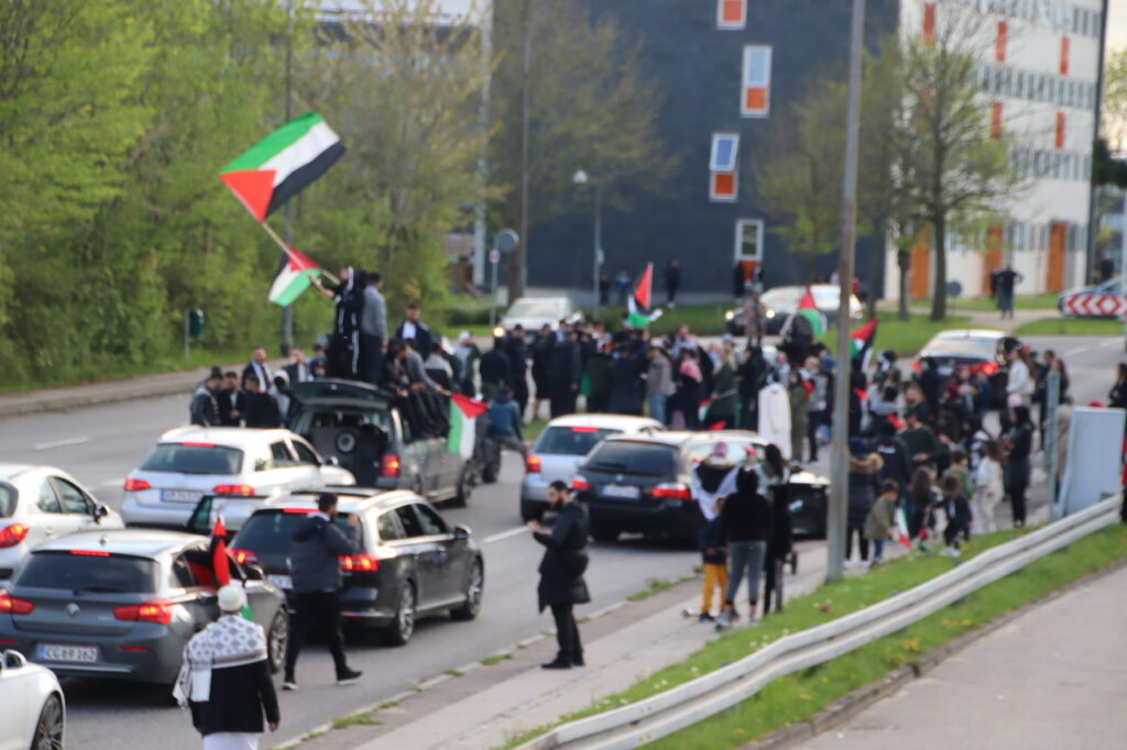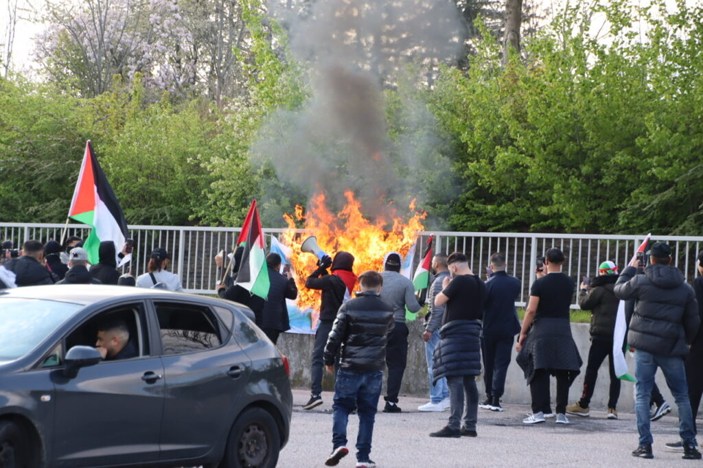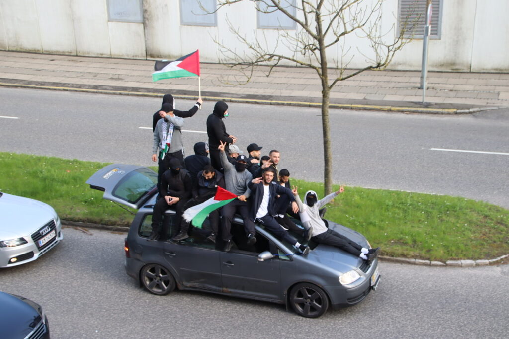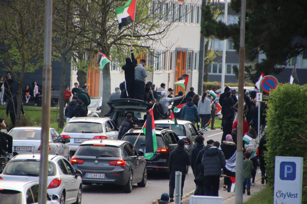 Det israelske flag er blevet brændt af og en stor gruppe mennesker går gennem byen med Palæstina flag.