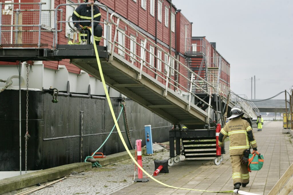 Politiet og brandvæsenet er mandag morgen til stede ved Havnefronten i Vordingborg, efter at der søndag aften udbrød brand i et skib, som er blevet ombygget til et stort hotel for udenlandske arbejdere.